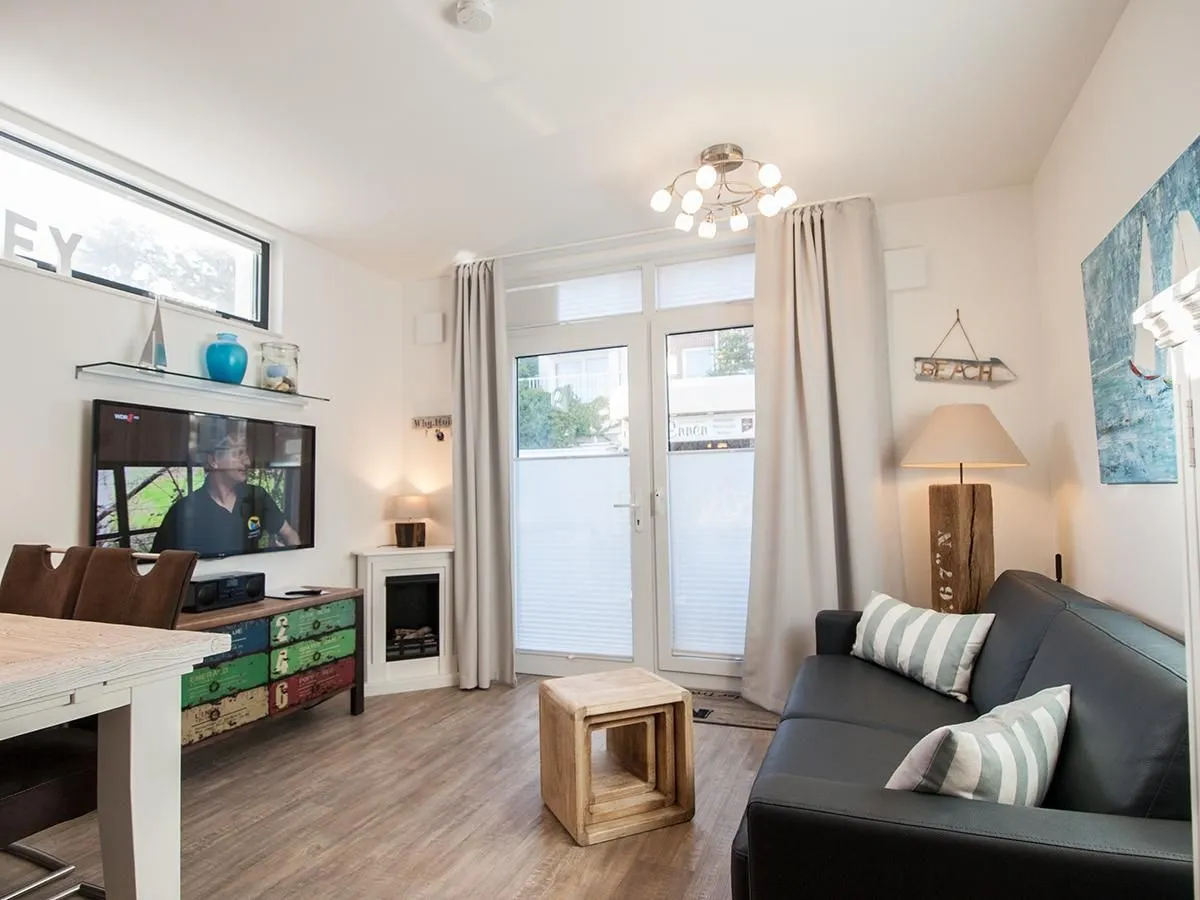 Das Wohnzimmer Ihrer Ferienwohnungen bietet Raum zum Entspannen und Relaxen. Hier finden Sie eine hochwertige Bettcouch mit einer