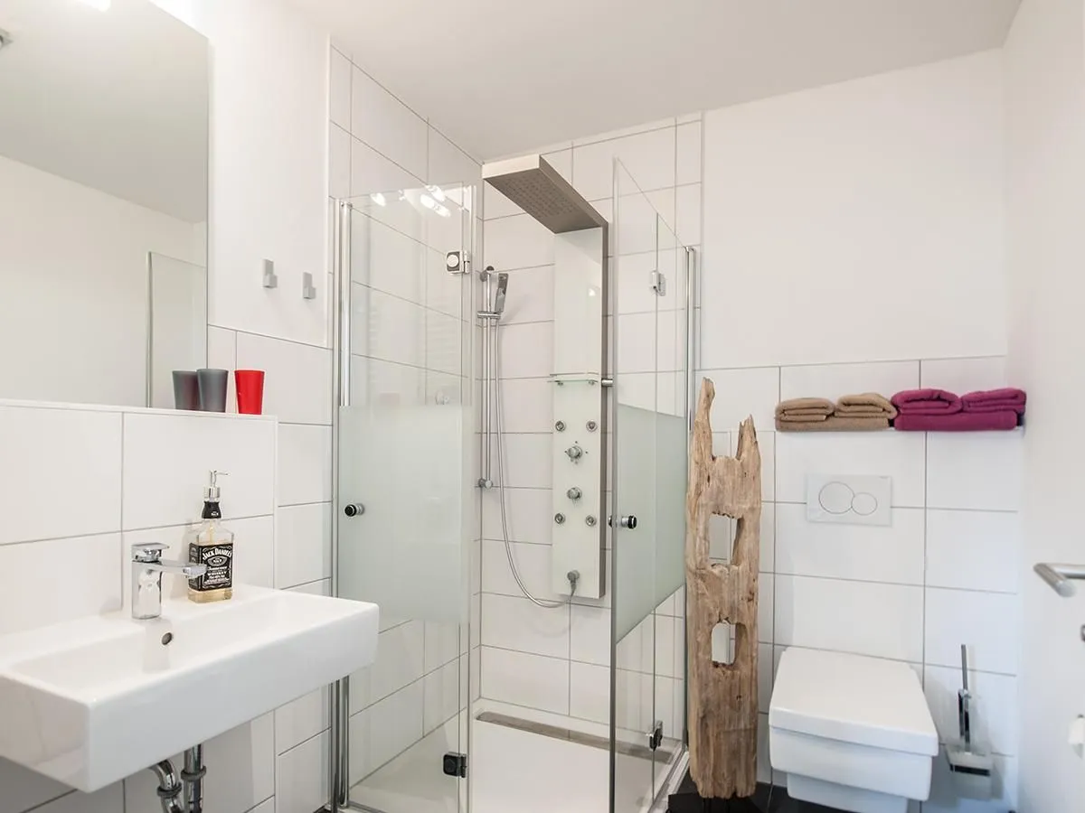 Bad mit WC, Waschbecken, Fön, Schminkspiegel, Duschsitz und als Highlight eine bodengleiche Duschtasse mit Rainshower.