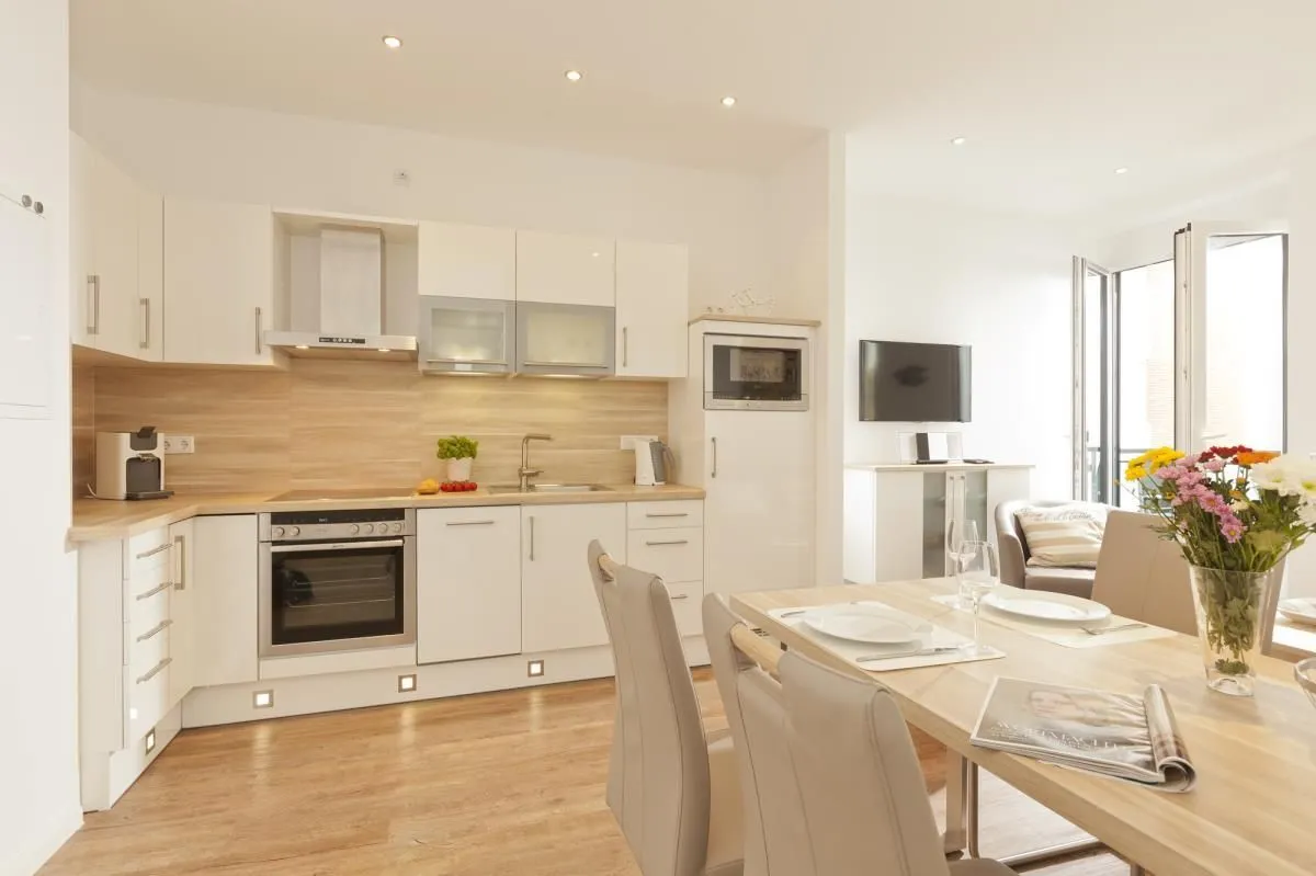 Die Ferienwohnung verfügt über eine moderne großzügige helle Wohnküche mit folgenden hochwertigen Ausstattungsdetails: Ceranfeld, Backofen, Spülmaschine, Kühlschrank mit Gefrierfach, Mikrowelle (alles von Neff), Toaster, Wasserkocher, Eierkocher und Senseo-Kaffeemaschine.