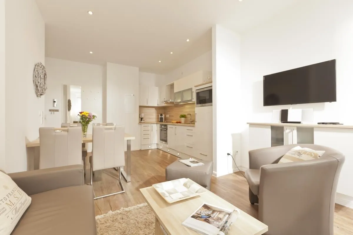 Im Wohnbereich finden Sie eine gemütliche Couch, Sessel, einen großen Samsung Flatscreen-Fernseher (39 Zoll) sowie einen Samsung Blueray/DVD-Player. Darüberhinaus gibt es eine CD-Dockingstation für alle iPhone-Modelle und iPad incl. Bluetooth und Airplay Funktion. Ein Mini-Balkon (1,5 qm, Ausrichtung Norden) mit Sitzgruppe für 2 Personen kann bei schönem Wetter genutzt werden.