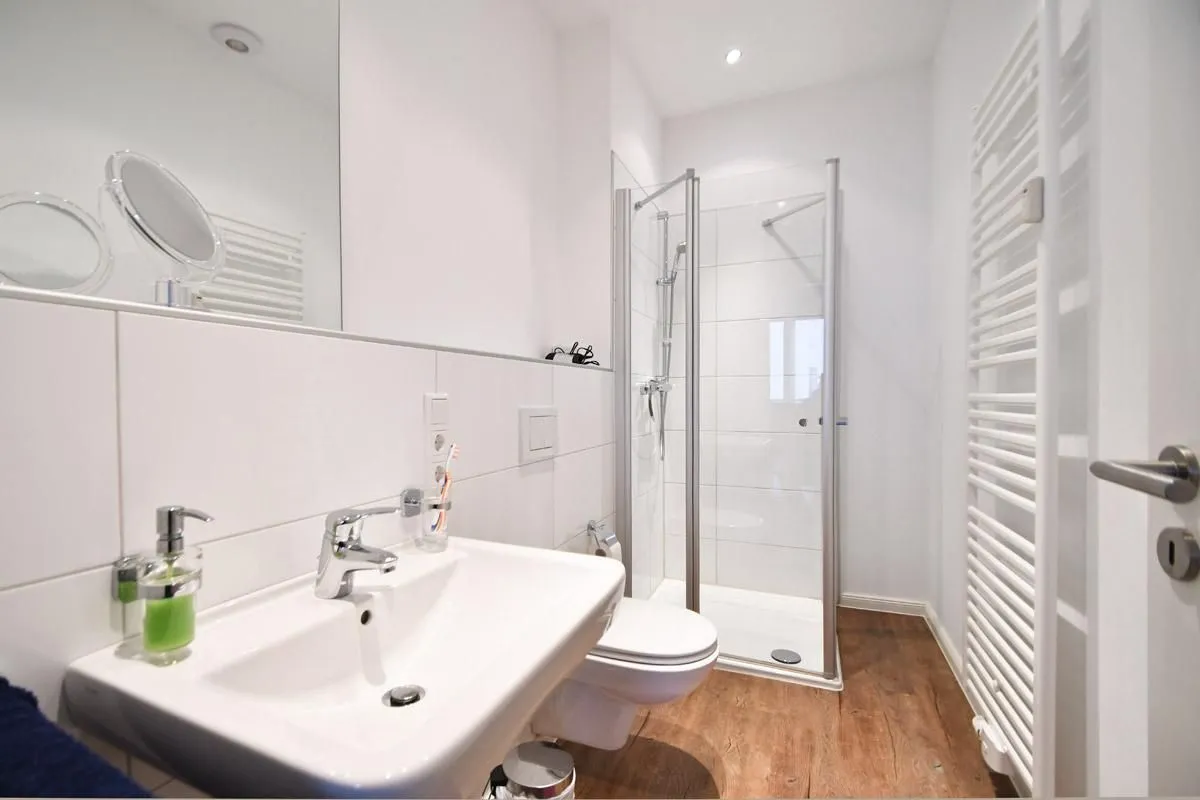 Ihre Ferienwohnung ist mit einem komfortabel eingerichteten Bad ausgestattet. Dies verfügt über eine große Dusche, Fön und Kosmetikspiegel.