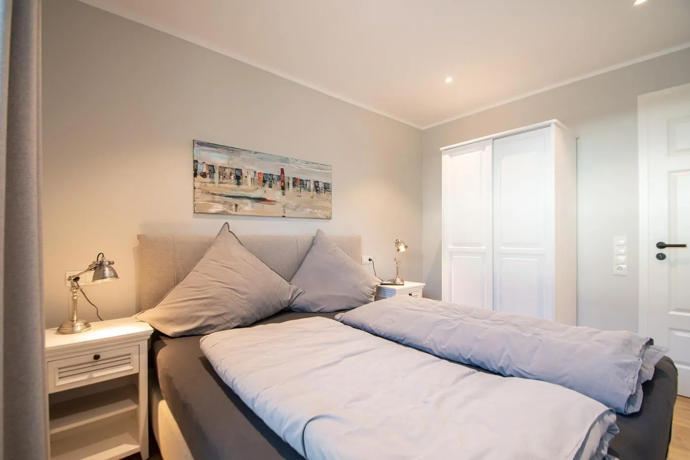 - Schlafzimmer mit Doppelbetten, Kleiderschränken und Flachbildfernsehern