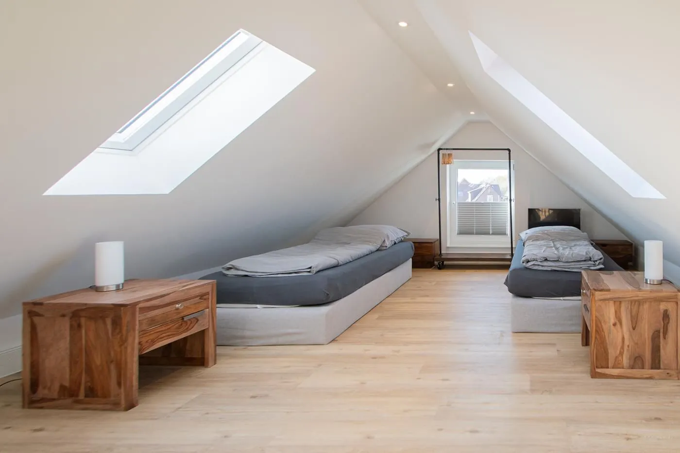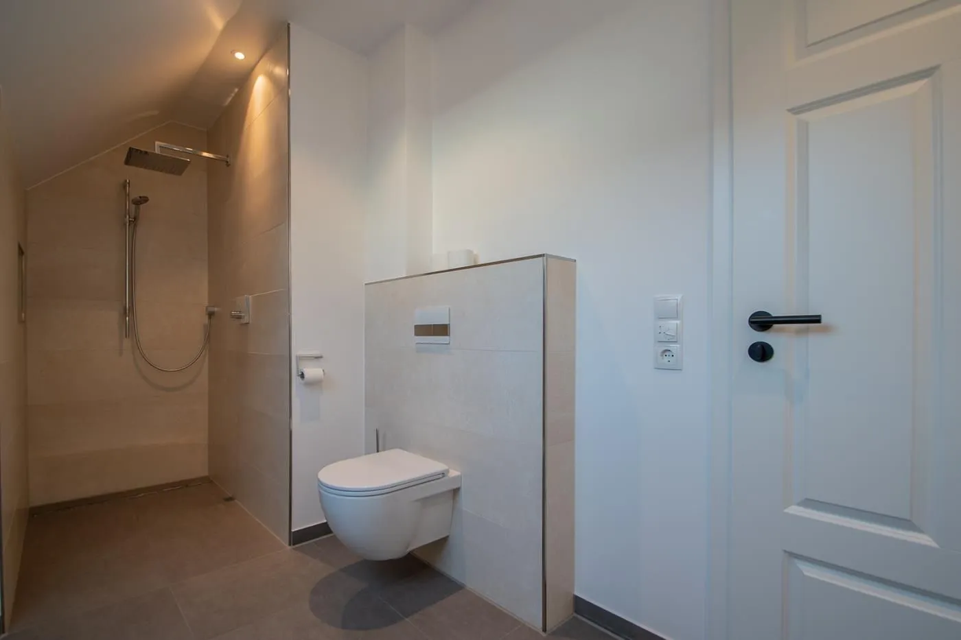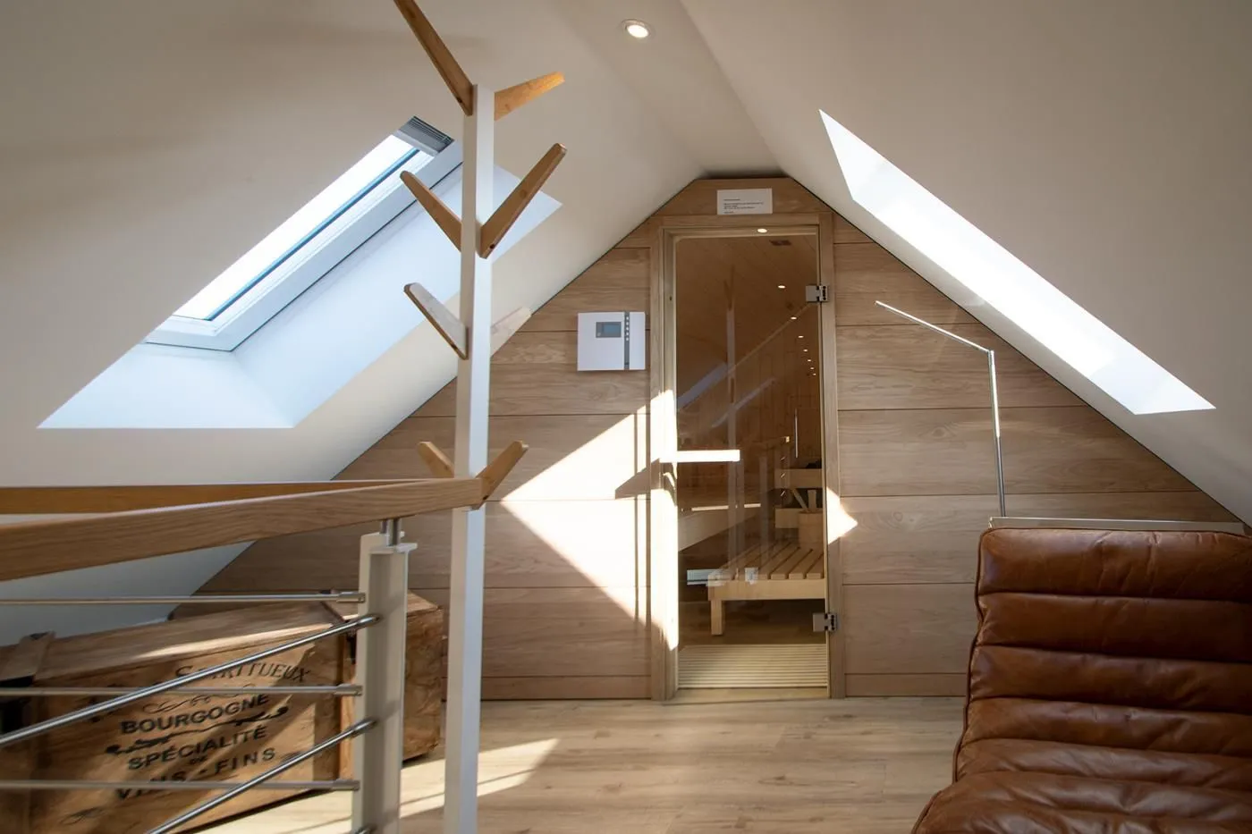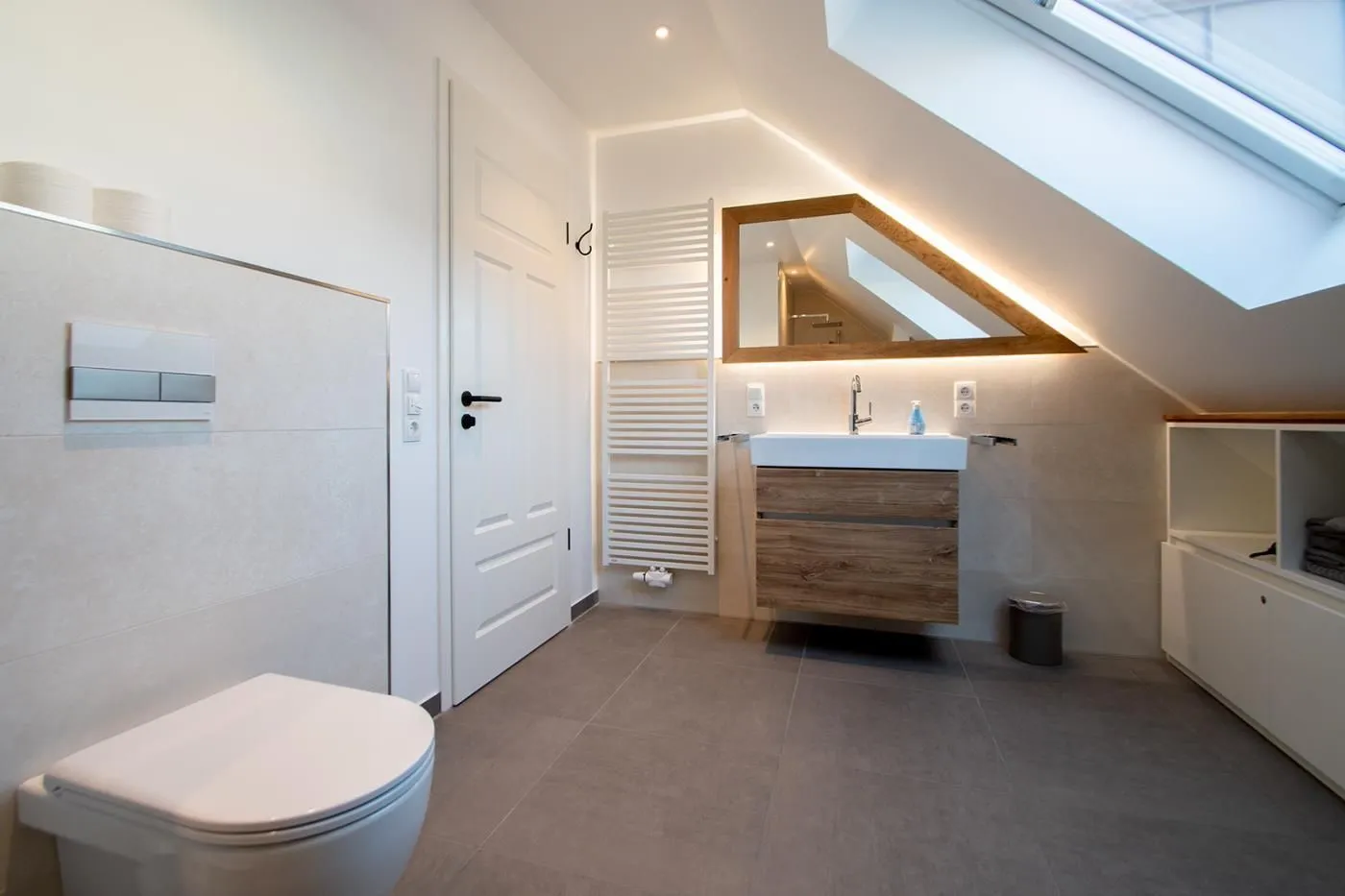 Über den Flur gelangen Sie in den offenen Küchenbereich, welcher an den hellen und großzügigen Wohnbereich angrenzt. Auf dieser Ebene befindet sich auch eines der beiden Schlafzimmer und ein großzügiges Badezimmer. Das Dachgeschoss erreichen Sie über eine Treppe. Dort erwartet Sie ein weiterer Schlafbereich und Ihre privater Sauna.