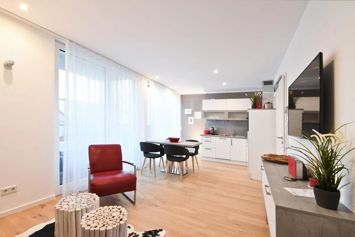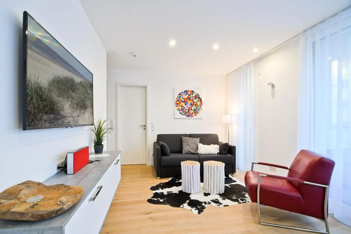 Das geräumige Wohnzimmer ist der Mittelpunkt Ihrer Komfort-Ferienwohnung. Hier finden Sie eine hochwertige Couch mit Schlaffunktion, einen Sessel, einen Hocker und einen großen LED-Fernseher. Der angrenzende Essbereich bietet Platz für vier Personen.