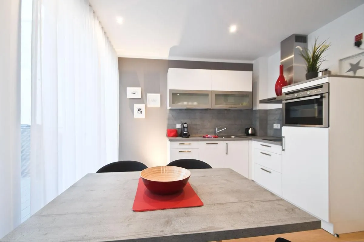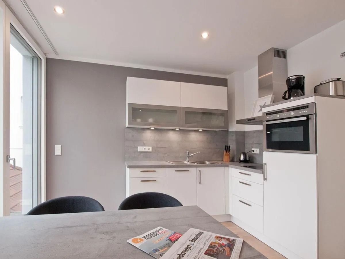 Die gut ausgestattete, moderne Küche bietet einen Kühlschrank, eine Backofen- /Mikrowellenkombination, eine Spülmaschine und ein Induktionskochfeld. Ein Wasserkocher, eine Kaffee und Kaffeekapselmaschine sowie ein Toaster sind ebenfalls vorhanden.