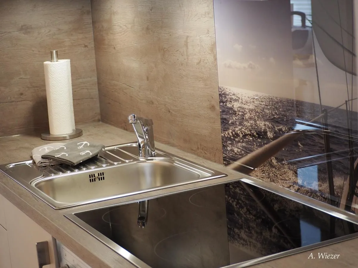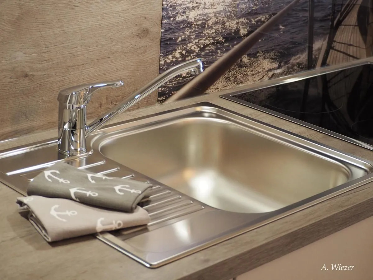 Die gut ausgestattete Küche lässt mit Backofen, Herd, Mikrowelle, Wasserkocher, Kaffeemaschine, Toaster, Kühlschrank mit Gefrierfach sowie Geschirrspüler und umfassendem Besteck und Geschirr keine Wünsche offen – ideal, um selbständig zu kochen und zu genießen. Für den Start in den Tag steht Ihnen zudem ein Mixer bereit. An den Wohnbereich schließt sich ein Balkon an, auf dem Sie draußen entspannen und die frische Nordseeluft genießen können.
