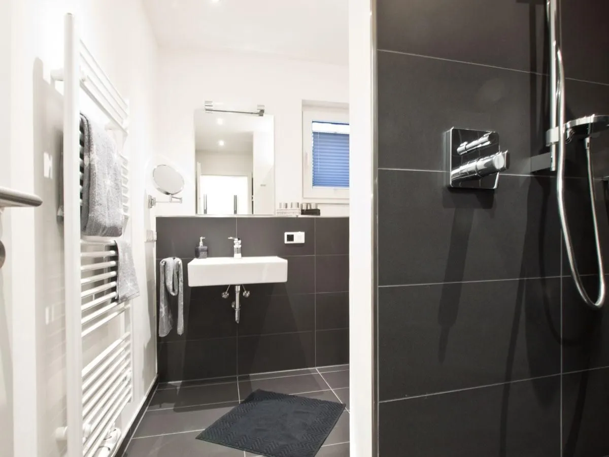 - Bad mit ebenerdiger Dusche, Waschtisch, WC und Radio