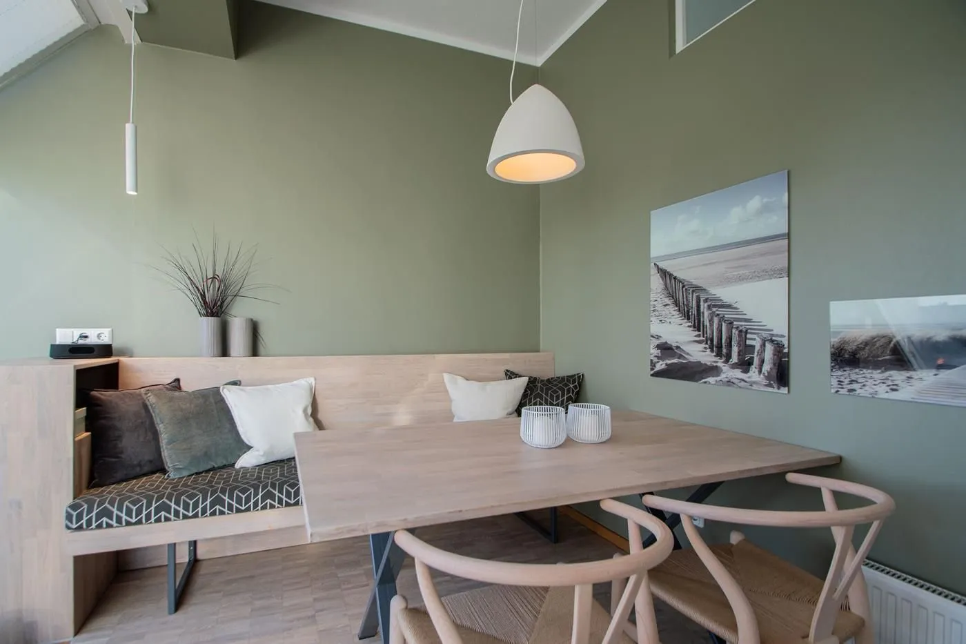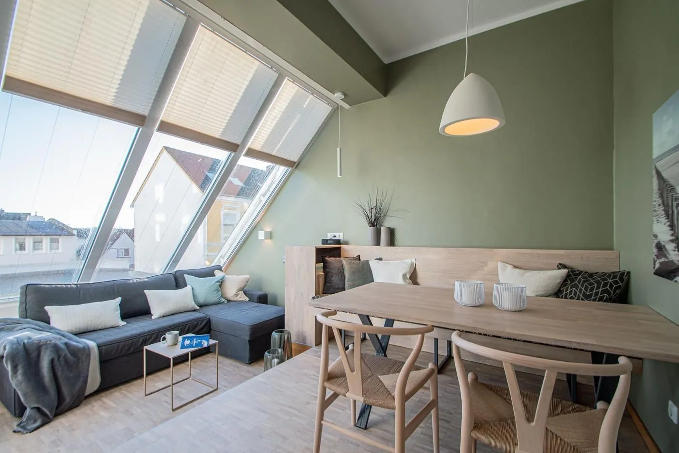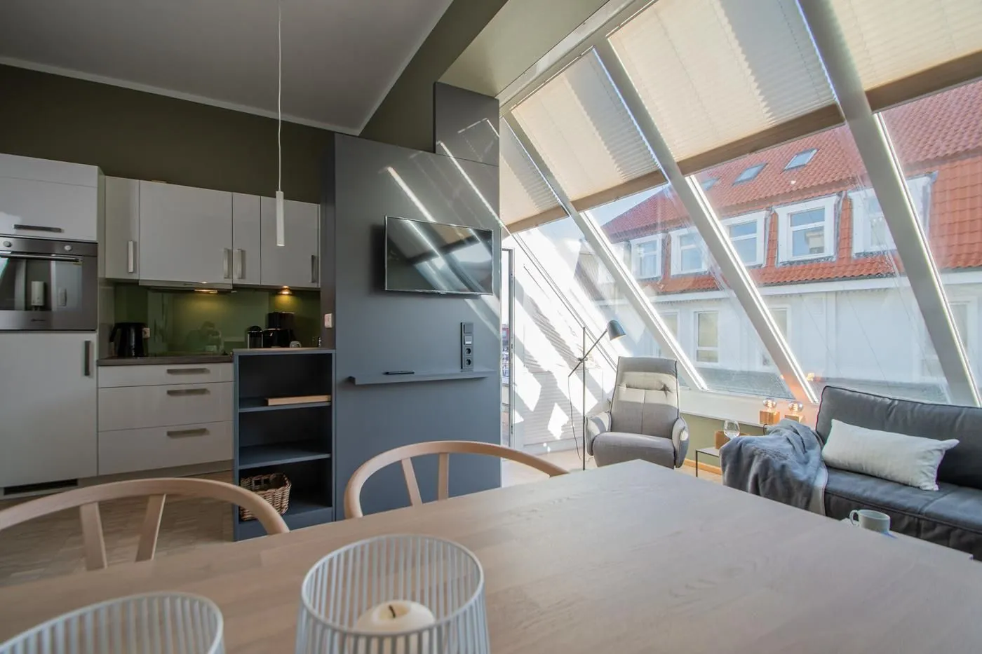 Der offene Wohnbereich erstreckt sich über die voll ausgestattete Küche, dem Essplatz für bis zu 4 Personen und der gemütlichen Lounge unter den großen Panormafenstern, welche an sonnigen Tagen beschattet werden können.