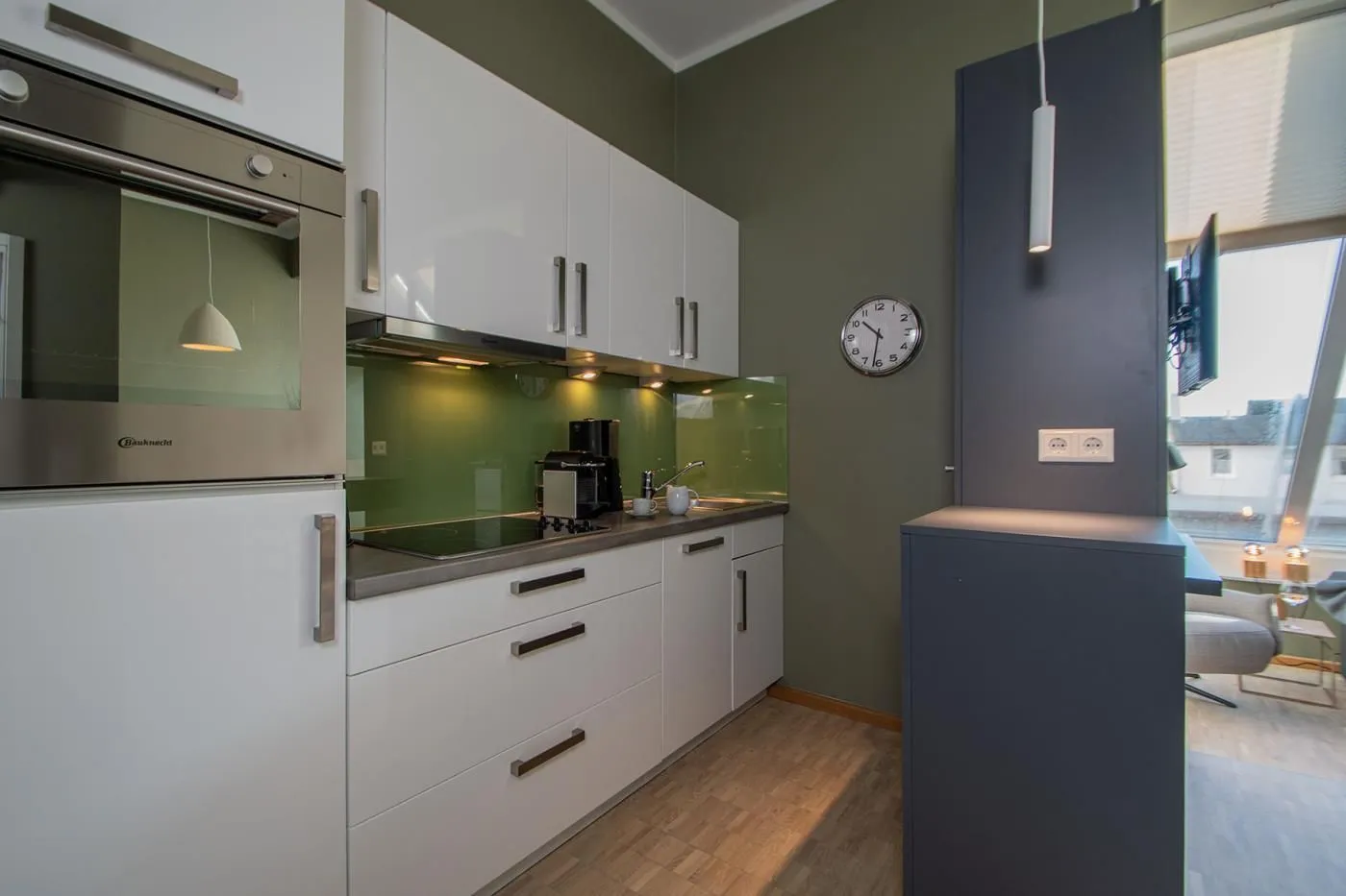 Komplett ausgestattete, moderne Küche mit Backofen, Kühlschrank mit Gefrierfach, Geschirrspüler, Herd, Mikrowelle uvm. Für einen genussvollen Kaffee zwischendurch bietet die Wohnung sowohl eine Filterkaffeemaschine als auch eine Nespresso-Kapselmaschine.