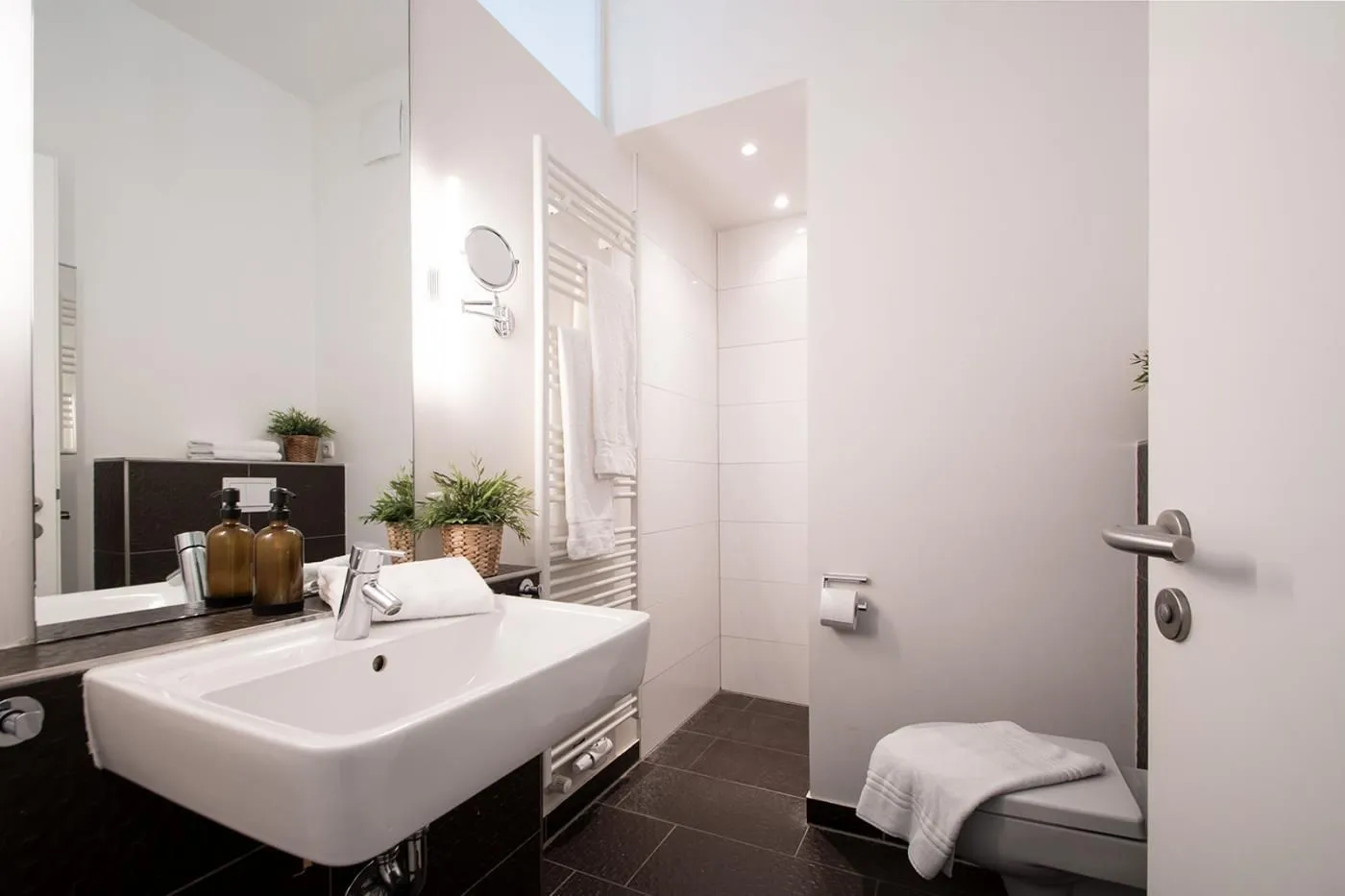 Modernes Bad mit bodengleicher Dusche, Waschtisch, Handtuchheizung und WC