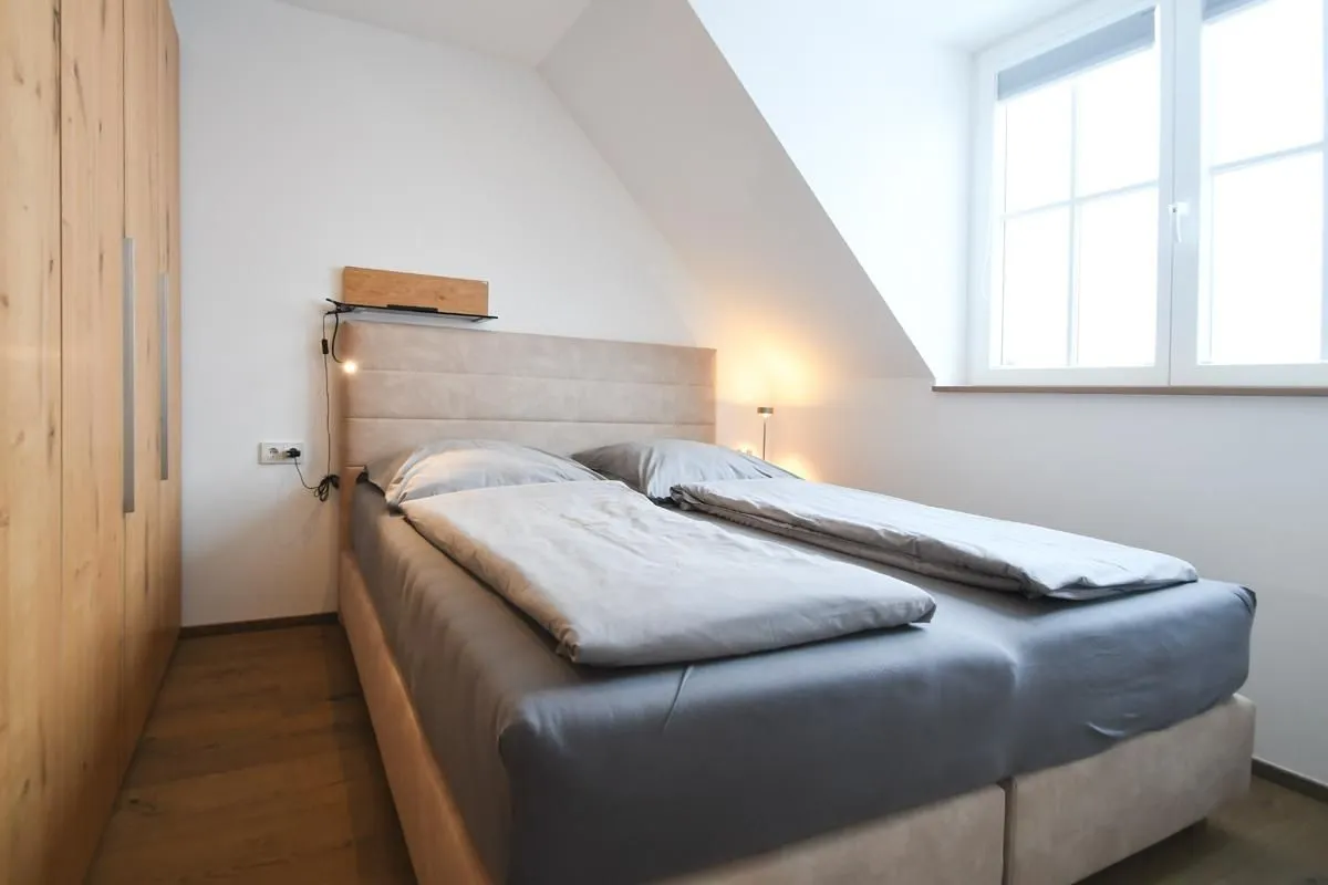 In Ihrer Ferienwohnung finden Sie ein gemütliches Schlafzimmer mit Doppelbett. Zur weiteren Ausstattung gehört ein Flachbildfernseher.