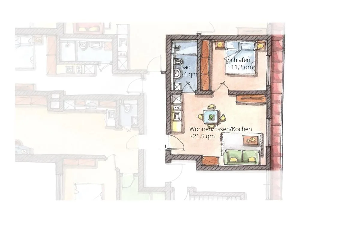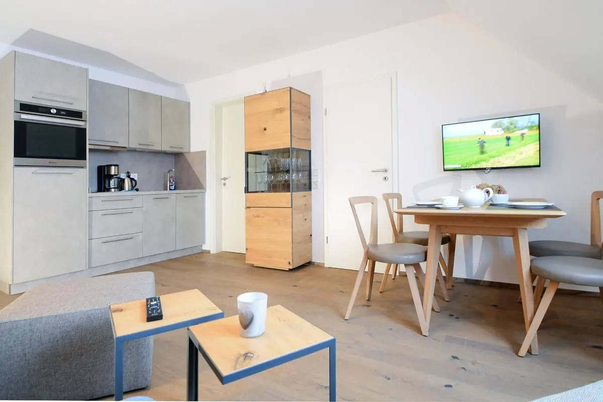 22 qm großer Wohnbereich mit voll ausgestatter Küchenzeile, gemütlichem Loungebereich und Flachbildfernseher (Schlafcouch vorhanden).