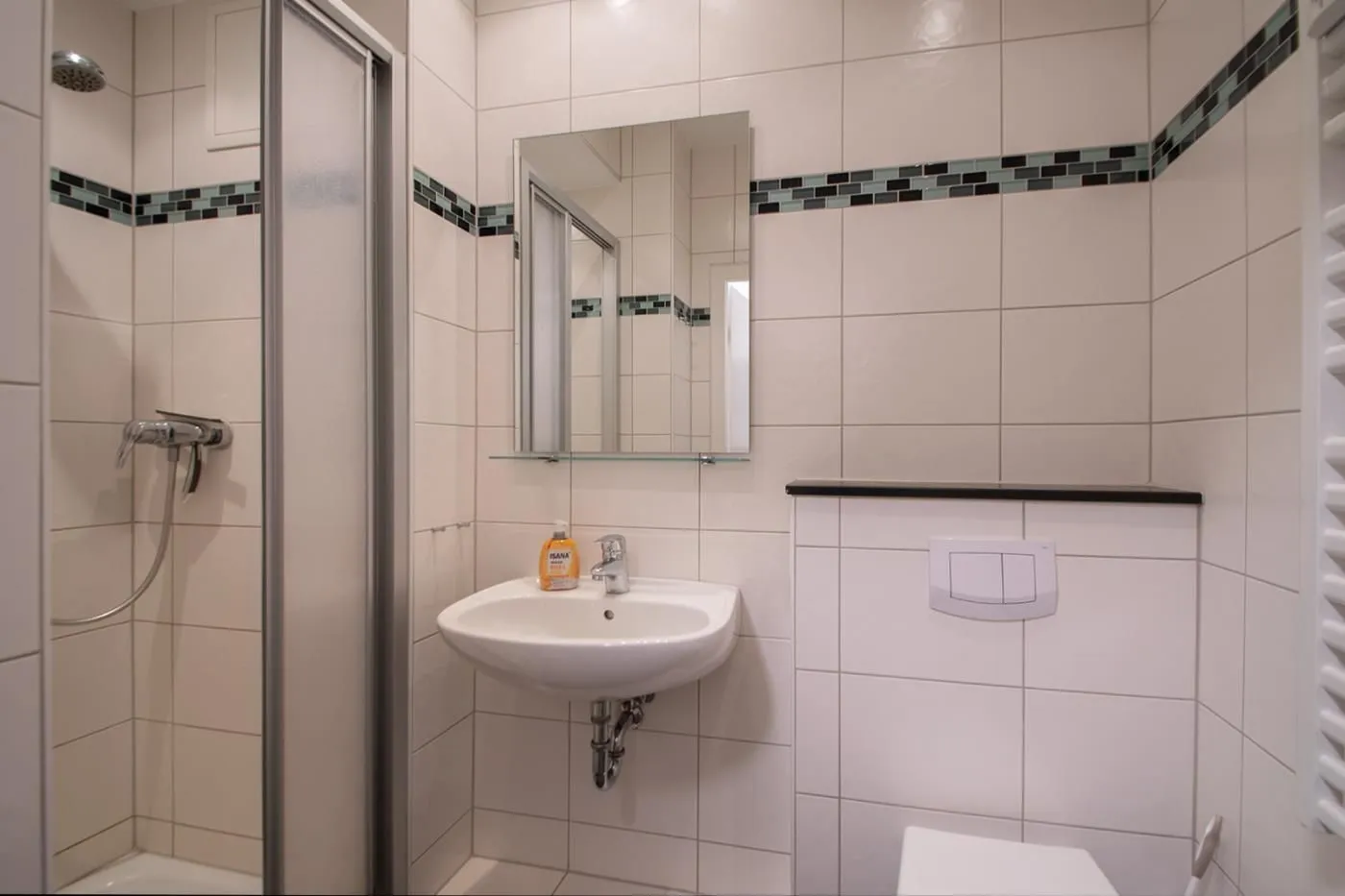 Das hell gefließte Bad verfügt über eine Dusche, WC und Handtuchheizung.