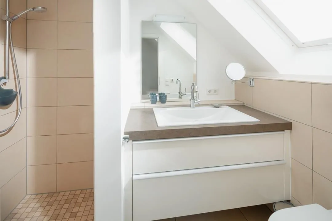 Das moderne Bad ist mit einer bodentiefen Dusche, WC, Spiegel, Fön und Kosmetikspiegel ausgestattet.
