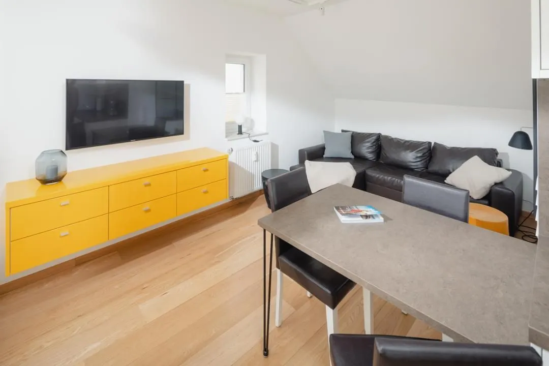 Die Küche ist mit einem Backofen, Ceranfeld, Spülmaschine, Kaffemaschine und einer Mikrowelle ausgestattet. Ein gemütlicher Wohnbereich mit Ledersofa und Flachbildfernseher sowie ein Esstisch sind sind der zentrale Mittelpunkt Ihrer exklusiven Ferienwohnung.