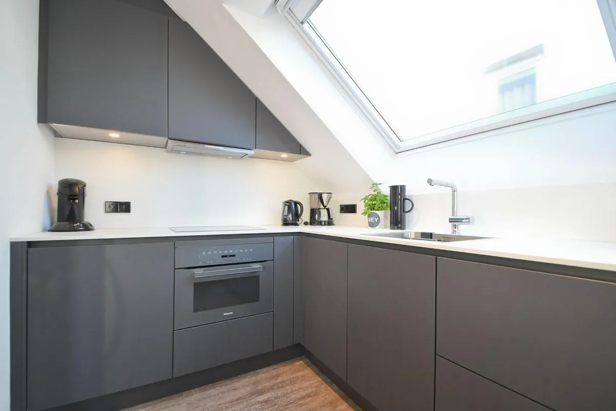 Hochwertige dunkelgraue Einbauküche mit großzügiger, heller Arbeitsfläche. Zur technischen Ausstattung mit hochwertigen Markengeräten, gehören ein Mirowellen-Kombibackofen, Ceranfeld, Kühlschrank, Spülmaschine, Kaffeemaschine, Senseo-Maschine sowie ein Toaster und ein Wasserkocher.