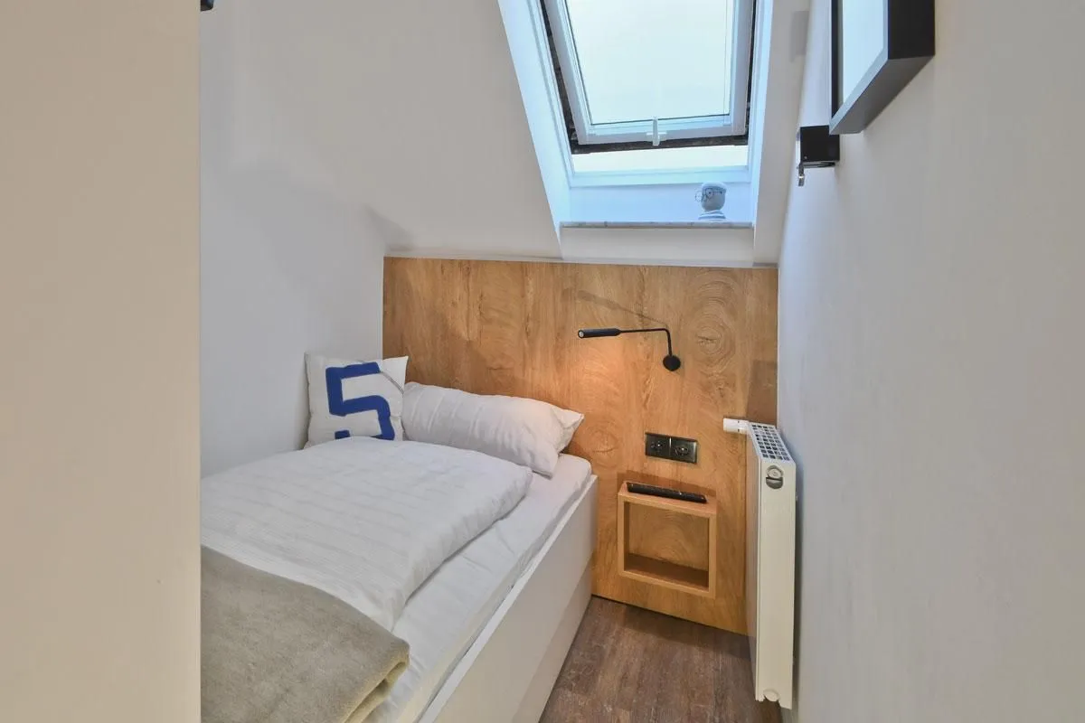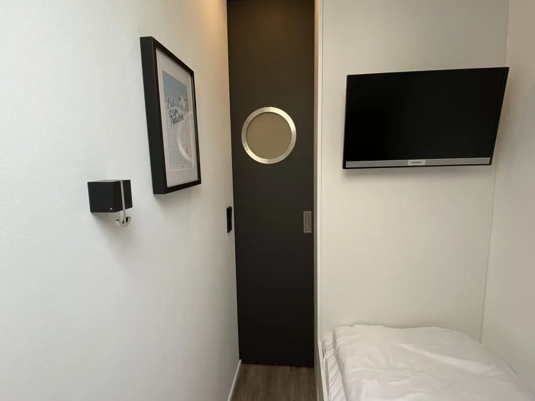 Bett (80x190cm), Taschenfederkernmatratze, unterhalb Stauraum für das kleine Reisegepäck, Flachbildfernseher, Schiebetür mit maritimer Gestaltung.