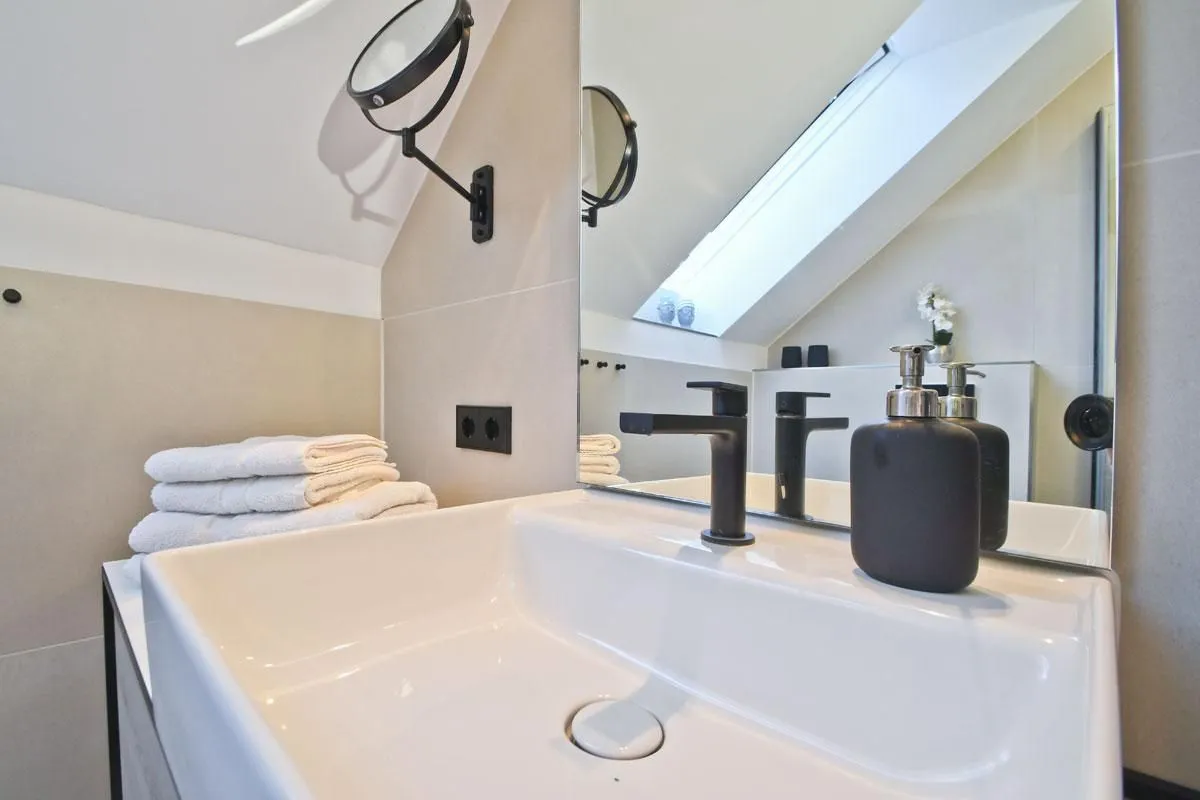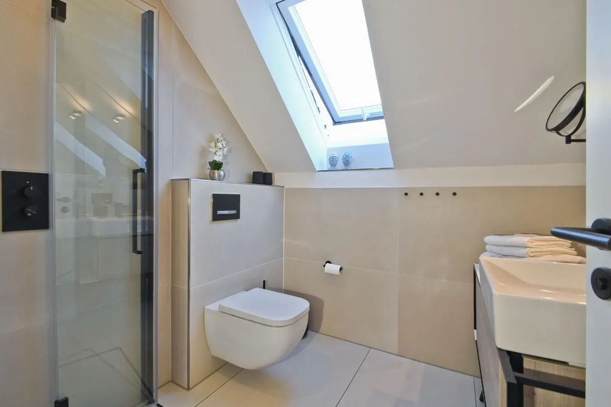 Tageslichtbad mit Designwaschtisch, bodengleicher Dusche, WC, Handtuchheizkörper und Fön. Das Bad ist mit großformatigen sandfarbenen Boden- und Wandfliesen bestückt.