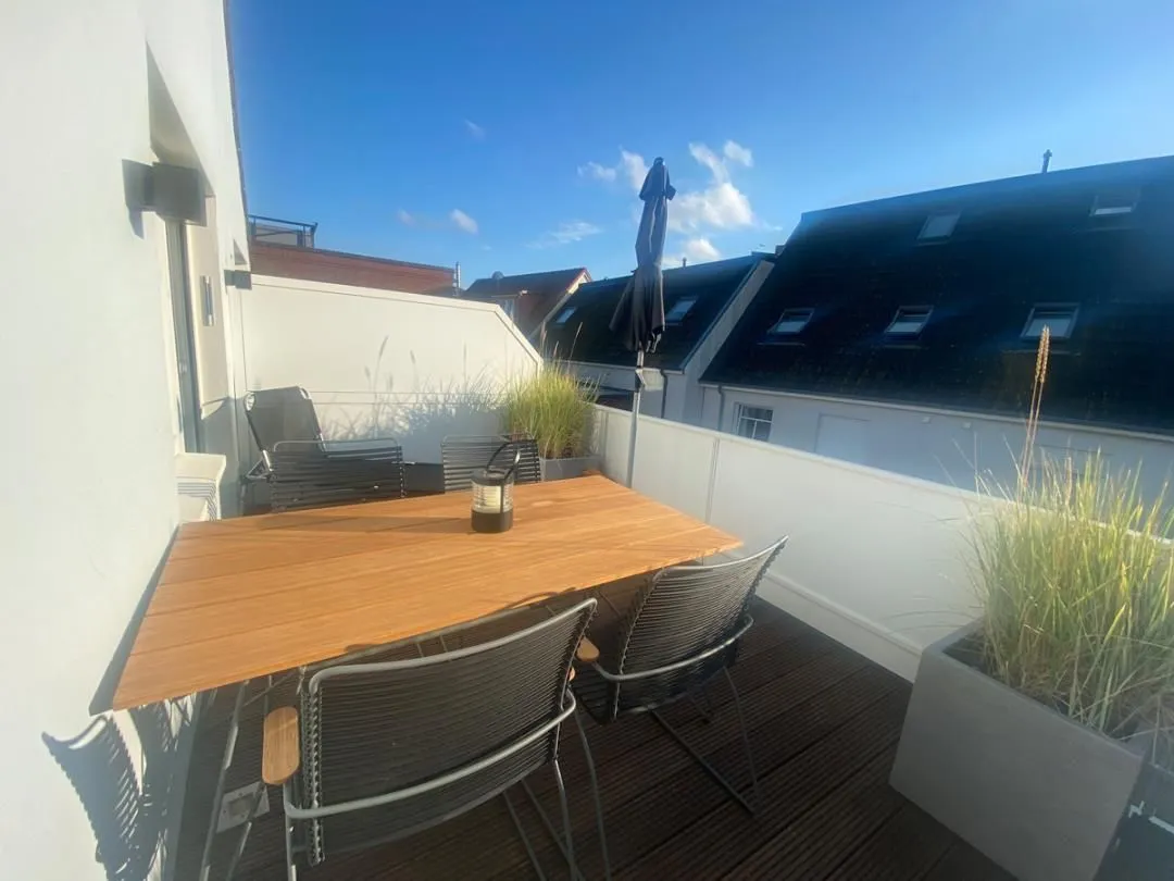 - Großer Südwestbalkon, 10m² , ein Tisch und vier Armlehnstühlen, Sonnenliege, Sonnenschirm und Wäscheleine sind vorhanden.