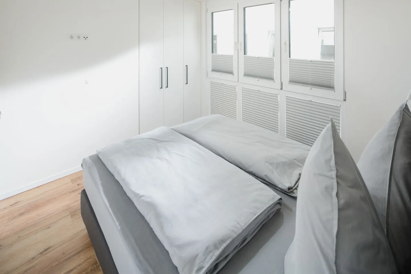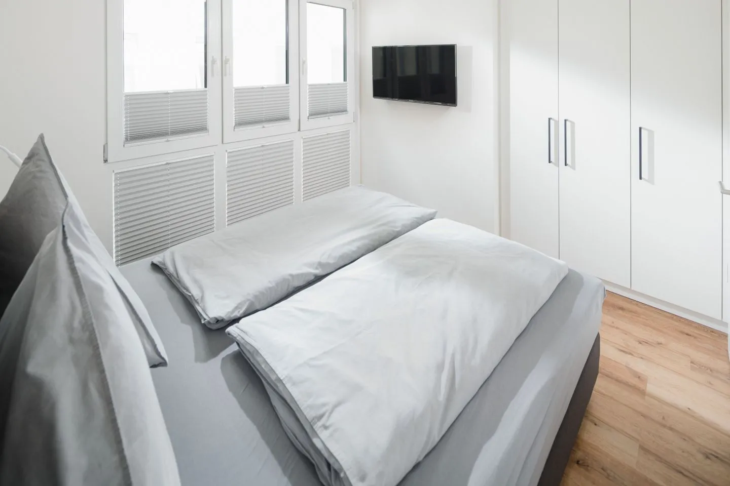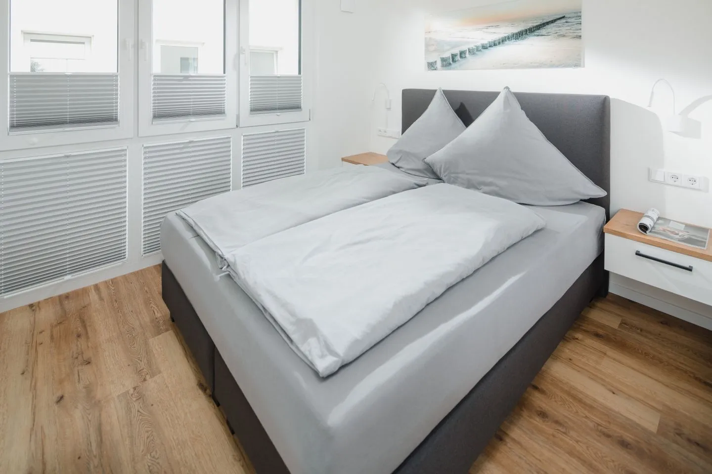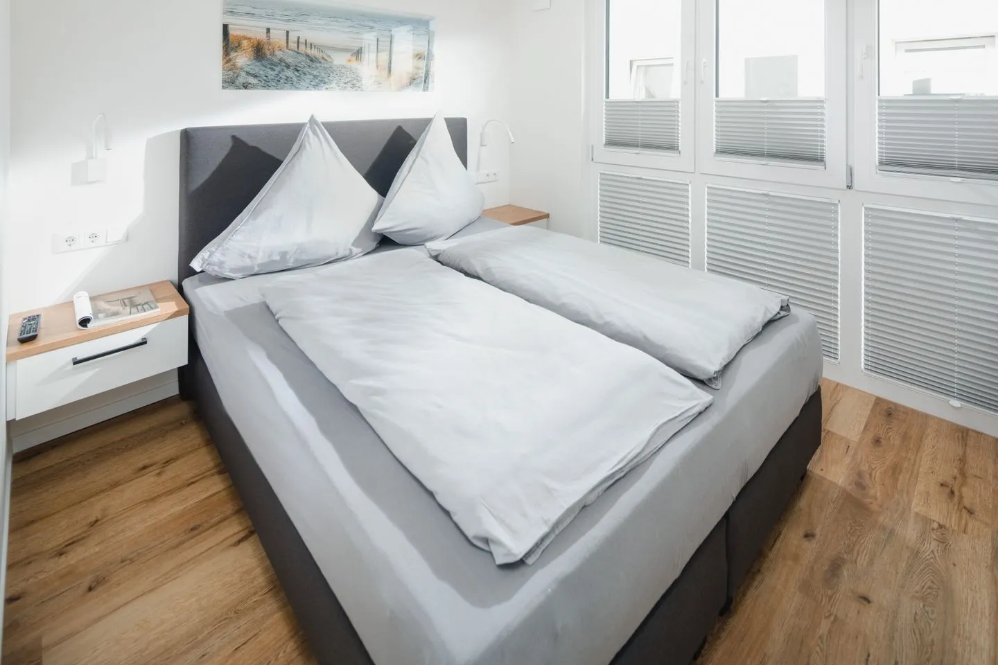 Ihre Ferienwohnung verfügt über zwei Schlafzimmer mit Doppelbett und Kleiderschrank. Die Räume können über Sonnenschutz und Plissees abgedunkelt werden. Ein Schlafzimmer ist mit einem Flachbildfernseher ausgestattet.
