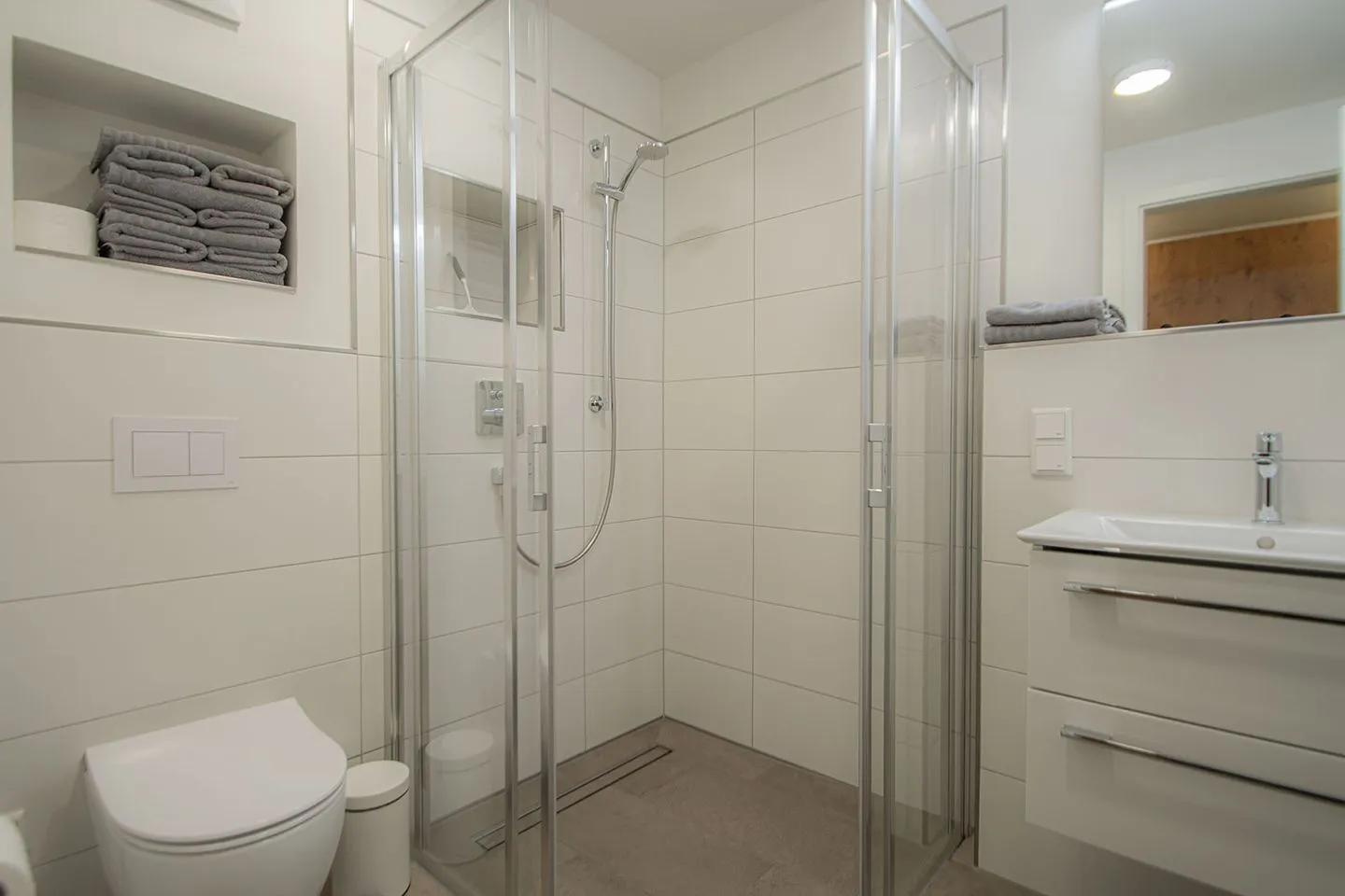 Ansprechendes Bad mit Dusche, WC, Fön und Handtuchheizung.