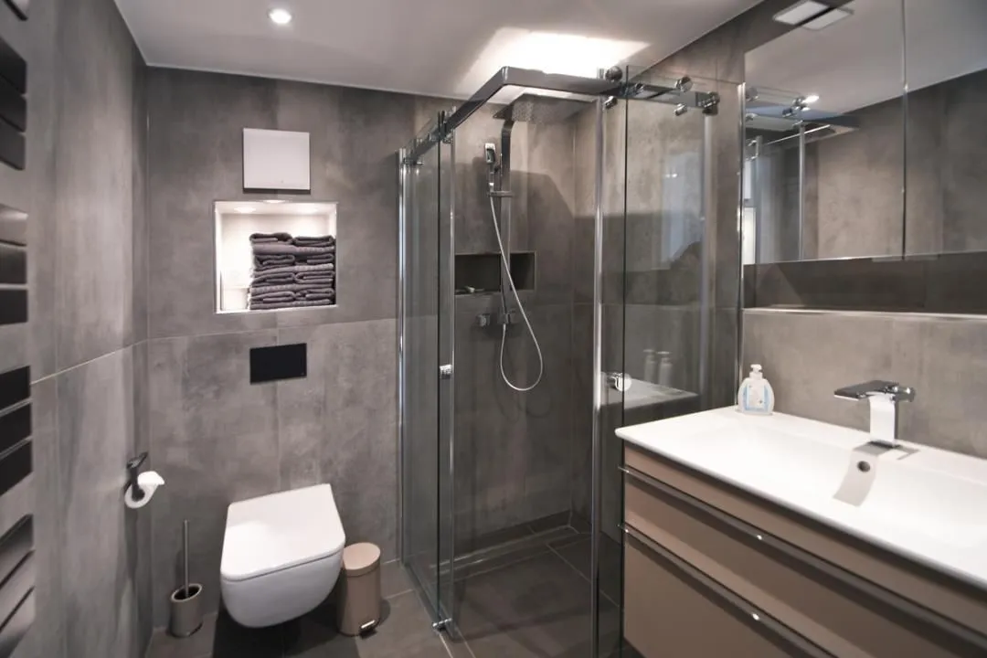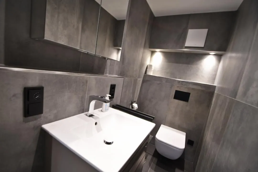 Modernes und exklusives Badezimmer mit bodengleicher Dusche, WC, Waschtisch und Handtuchheizung. Fön/Haartrockner vorhanden. Ihre Ferienwohnung bietet ein separates Gäste-WC.