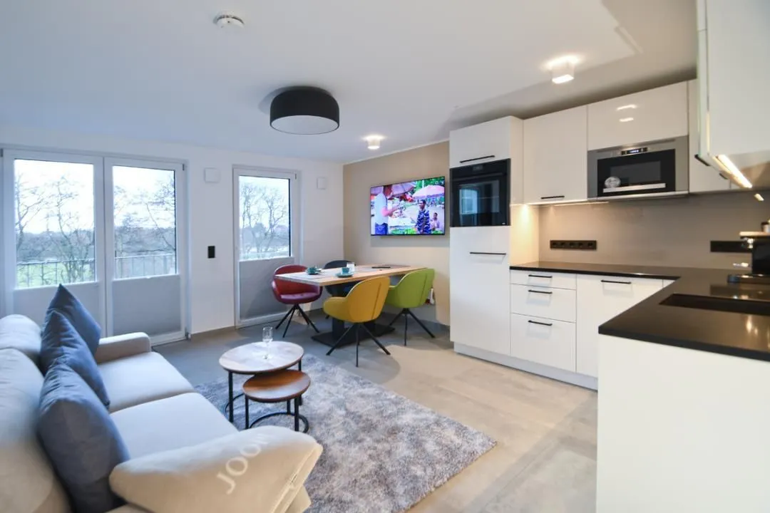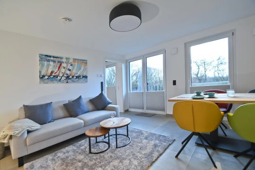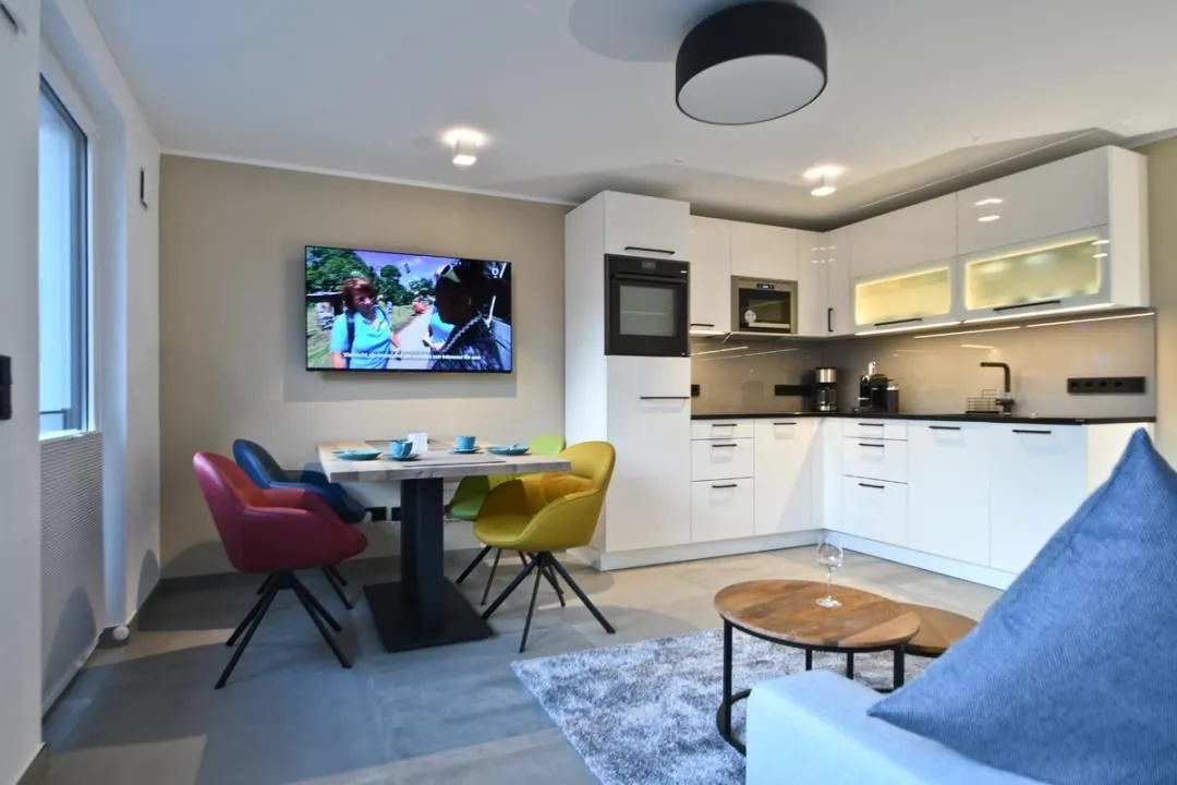 Heller Wohnbereich mit großer Fensterfront, modern eingerichtet mit einem gemütlichen Sofa, Essbereich für 4 Personen und einem großen Flachbildfernseher.