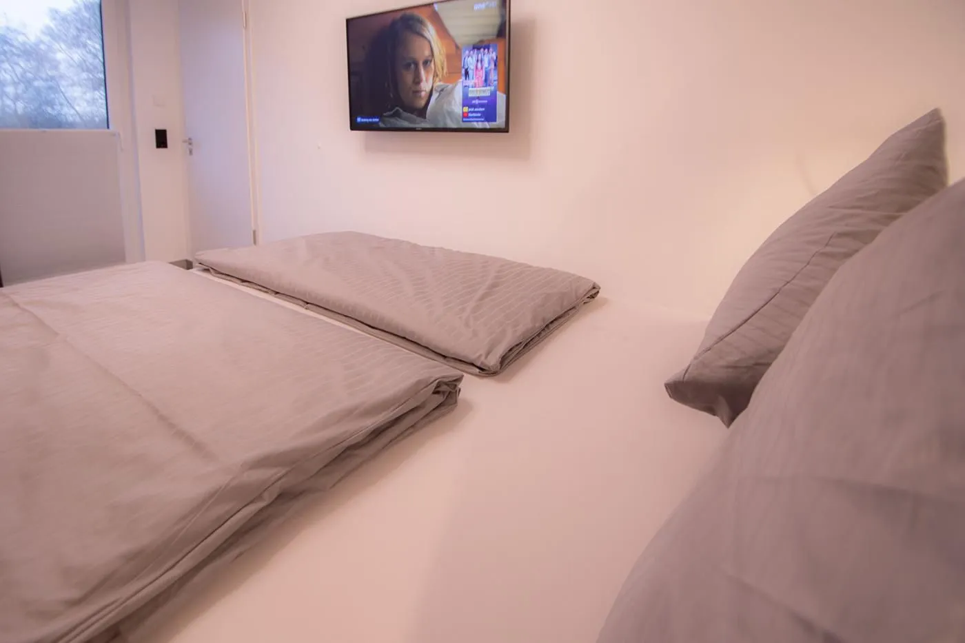 Flachbildfernseher auf Sie. Der Raum kann mit einem Vorhang und Sonnenschutzplisses abgedunkelt werden.