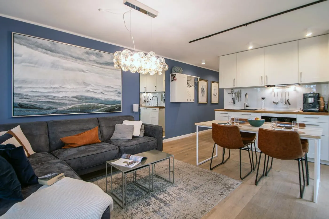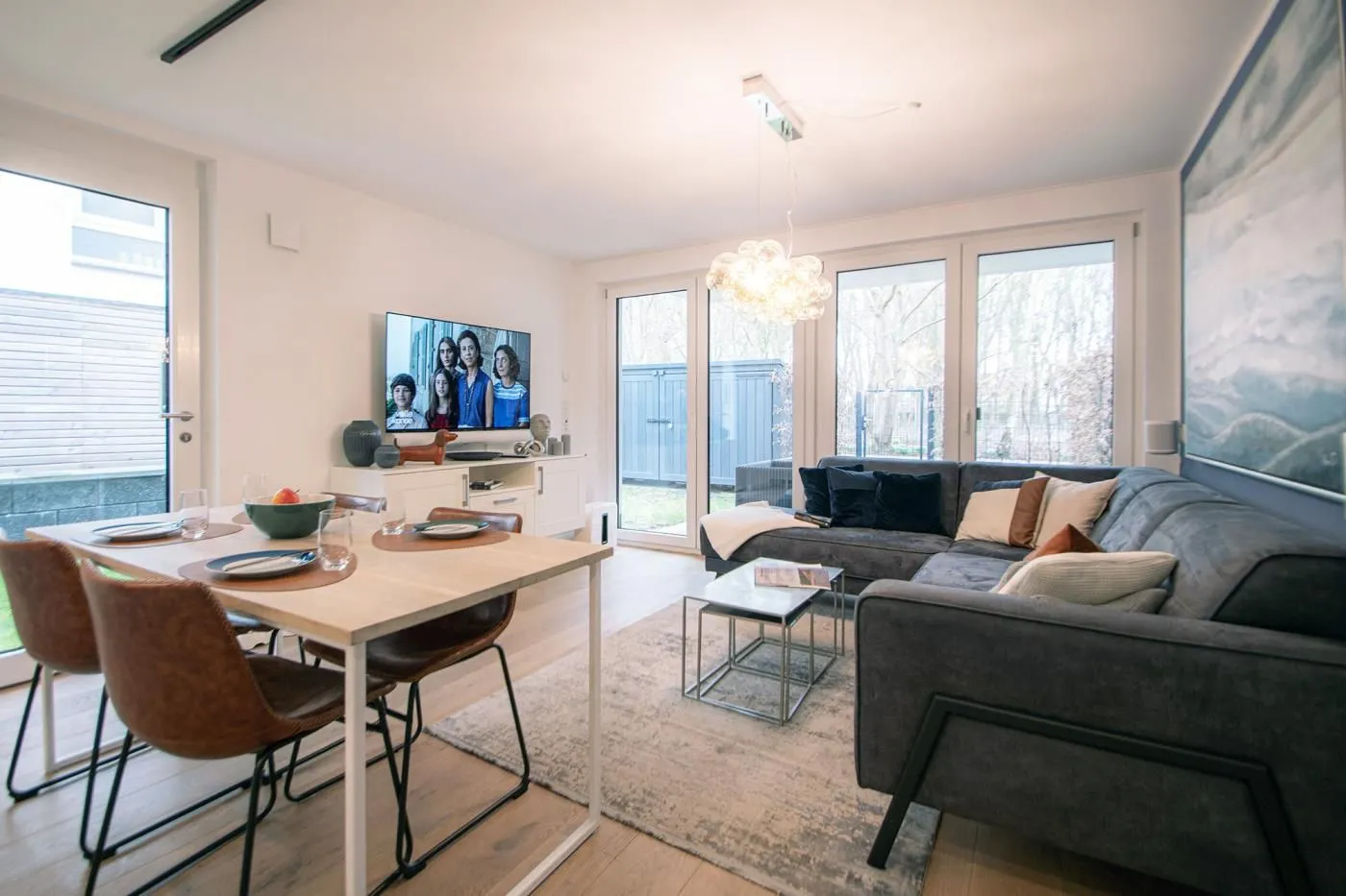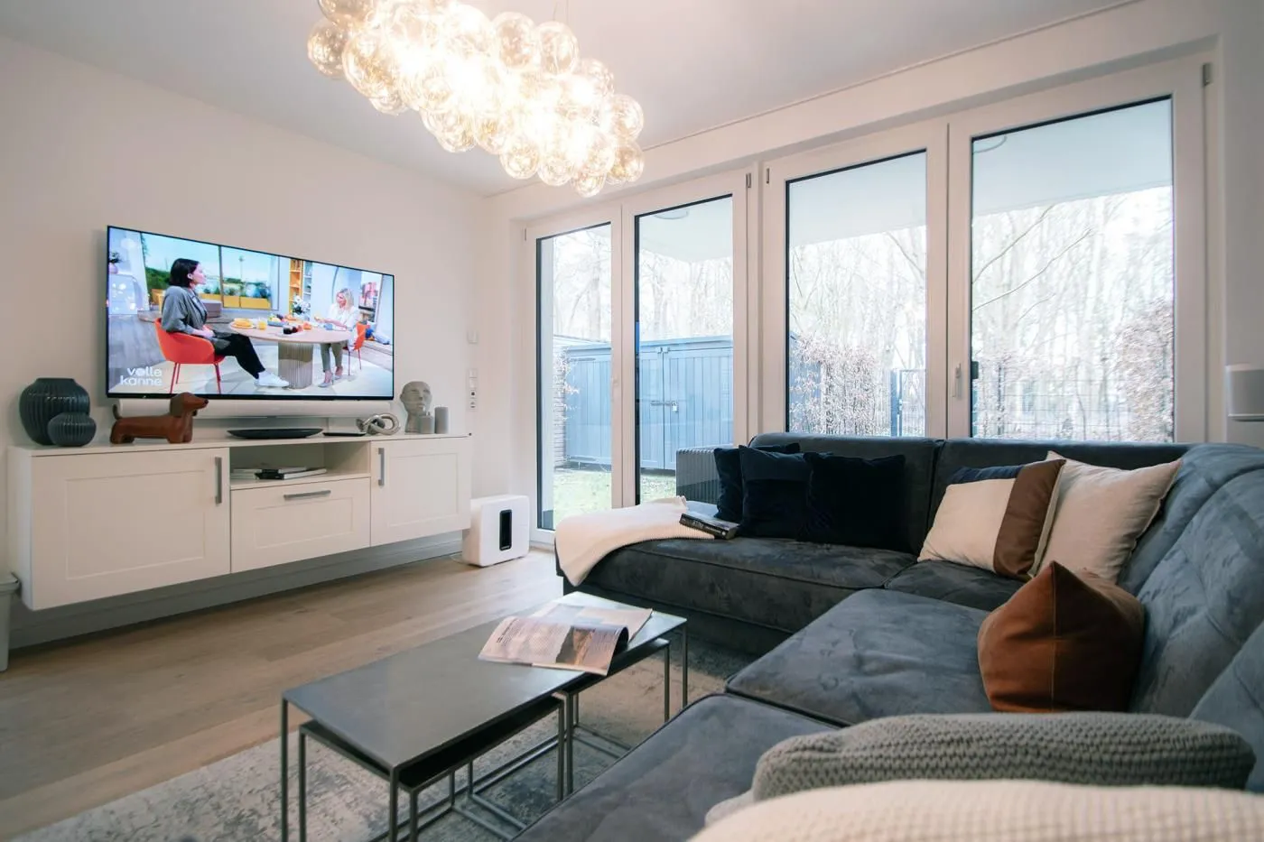 Heller Wohnbereich mit großer Fensterfront, modern eingerichtet mit einem gemütlichen Sofa, Essbereich für 4 Personen und einem großen Flachbildfernseher mit Sonos Soundsystem.