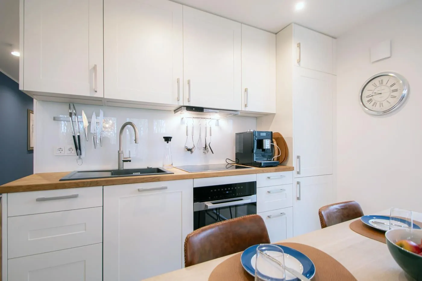 Voll ausgestattete Küche mit Backofen, Kühlschrank, Spülmaschine, Wasserkocher und Kaffeemaschine.