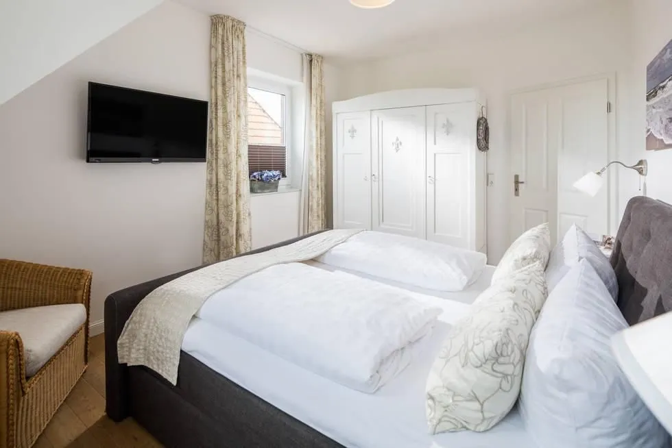 Das Schlafzimmer im unteren Bereich ist mit einem bequemen Doppel-Boxspringbett und einem großen Kleiderschrank ausgestattet. In der offenen, hellen Maisonette-Etage befinden sich ein Schlafzimmer, ebenfalls mit einem bequemen Doppel-Boxspringbett, einer geräumigen Kommode und einem - vom Schlafzimmer aus zugängigen kleinen Bad mit Badewanne.