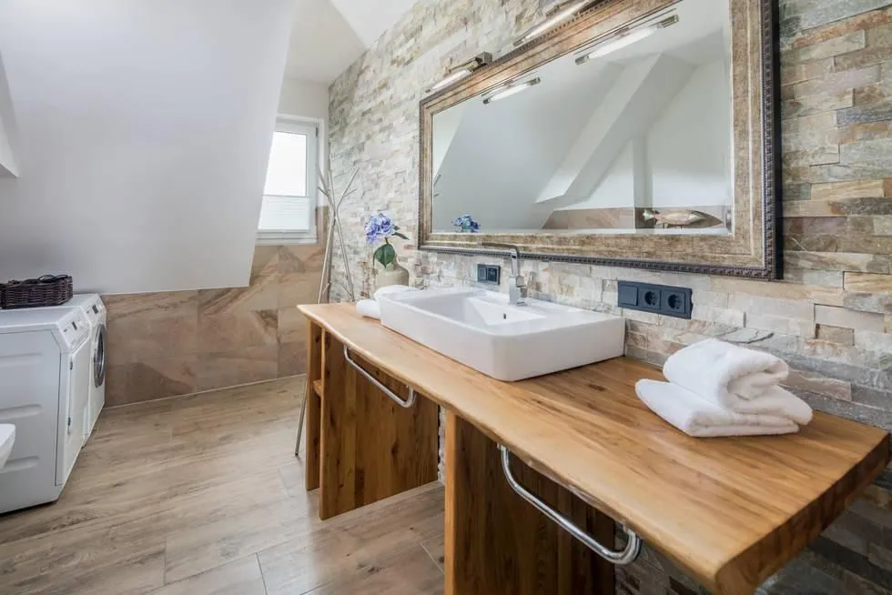 Ein großzügiges Badezimmer mit ebenerdiger Glasdusche, großem Holzwaschtisch und einem WC befindet sich direkt neben dem unteren Schlafzimmer.