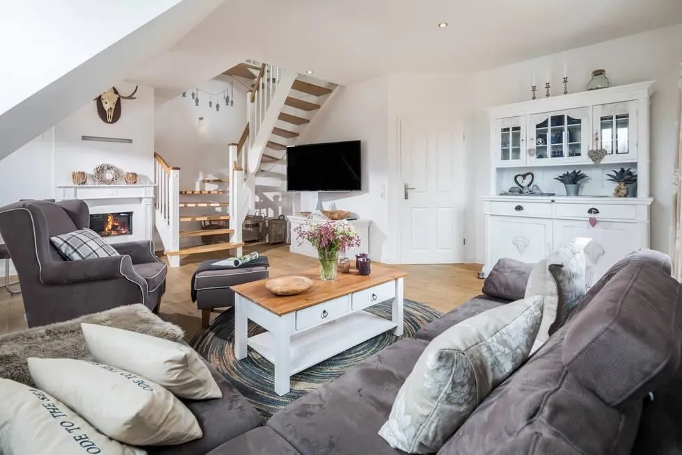 Hochwertige Dekostoffe der englischen Marke 'Prestigious Textiles', ausgesuchte Möbel und individuelle Wohnaccessoires (z.B. von 'Loberon') sowie das blaue Friesengeschirr 'Ammerland Blue' ergänzen das niveauvolle Ambiente der Elisa auf allen Wohnebenen. Ein Echtholzfußboden in den Wohn- und Schlafbereichen unterstreicht den individuellen norddeutschen Landhausstil. Eine eigene Waschmaschine und ein Trockner (beides Miele) stehen kostenlos zur Verfügung.