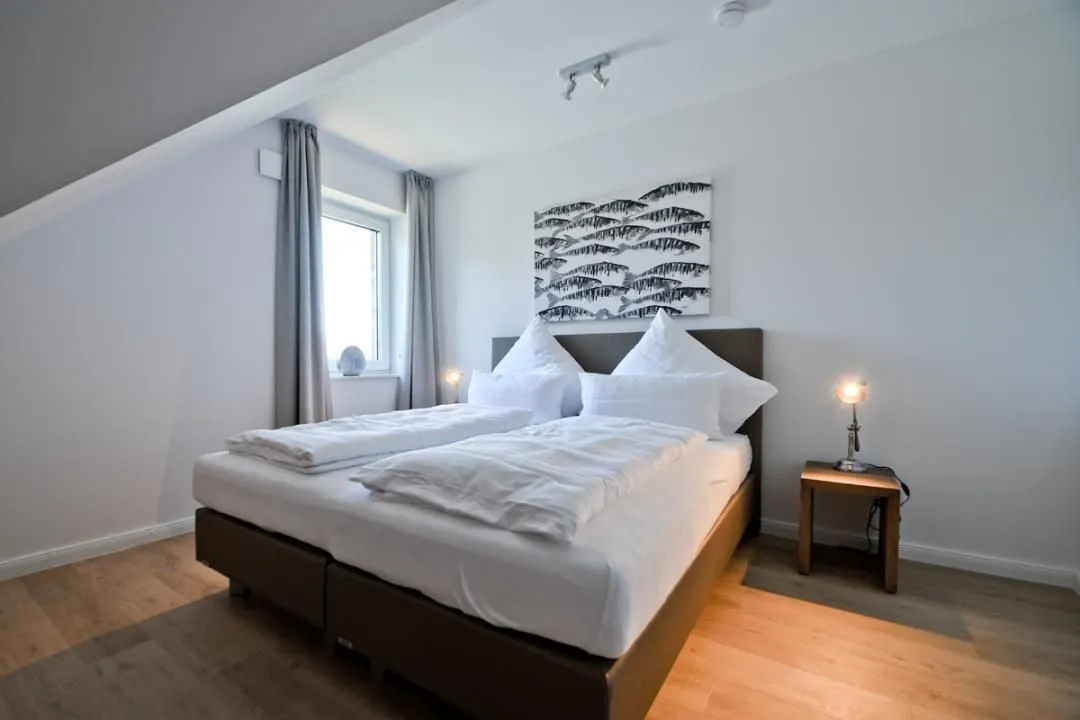 Die Feirnwohnung verfügt über zwei Schlafzimmer. Im Obergeschoss mit Doppelbett, Kleiderschrank und Flachbildfernseher, im Dachgeschoss ein weiteres mit zwei Einzelbetten und Flachbildfernseher