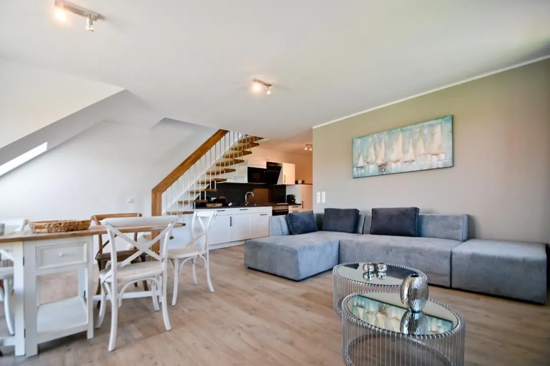 Über den Flur gelangen Sie in den offenen Küchenbereich, welcher an den hellen und großzügigen Wohnbereich angrenzt. Auf dieser Ebene befindet sich auch eines der beiden Schlafzimmer. Das Dachgeschoss erreichen Sie über eine Treppe im Wohnraum. Dort erwartet Sie ein weiteres Schlafzimmer mit zwei Einzelbetten.
