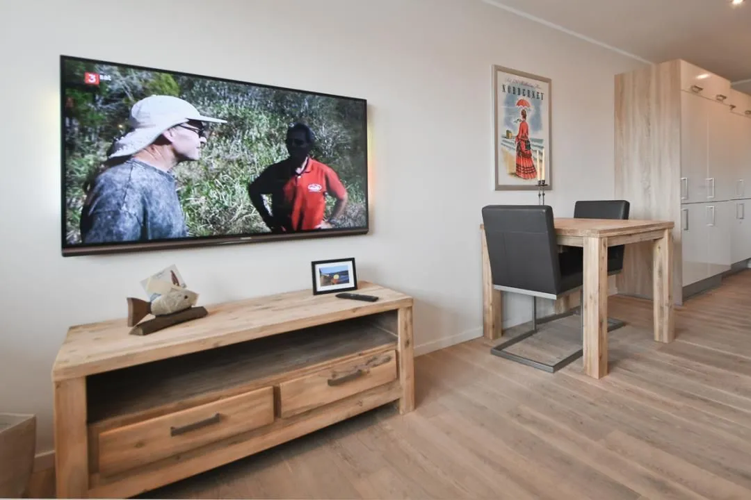 Offener Grundriss mit großem Ecksofa, Flachbildfernseher und Essbereich für zwei Personen. Angrenzend am Wohnzimmer befindet sich die gemütliche Schlafkoje (140 x 200cm) für 2 Personen.