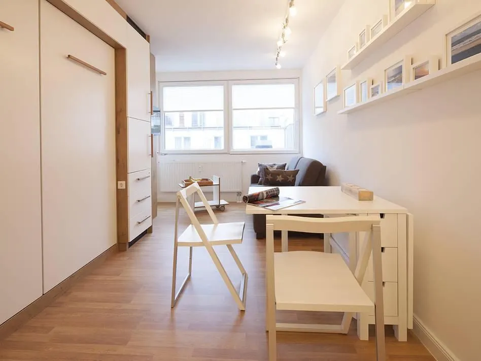 Die Ferienwohnung verfügt über einen hellen Wohn-, Schlafbereich, der mit zwei sehr komfortablen und hochwertigen Schrankbetten sowie einem TV, Sofa und Esstisch ausgestattet ist.