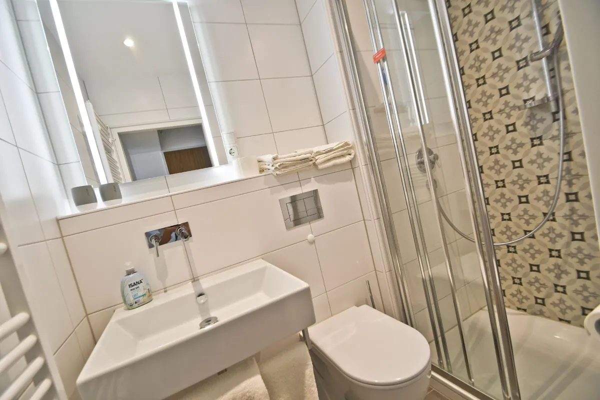 Das moderne Badezimmer bietet eine Dusche, WC, Handtuchkeizung und ein Waschbecken.
