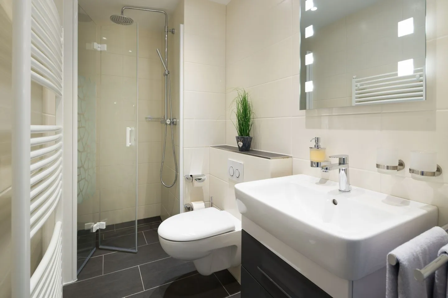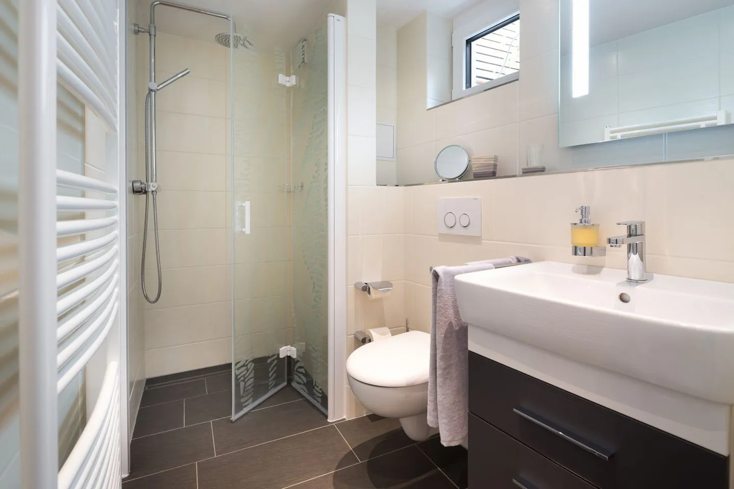 Dusche mir Regenwaldbrause, Heizkörper jederzeit betriebsbereit, Fön und Kosmetikspiegel, Radio