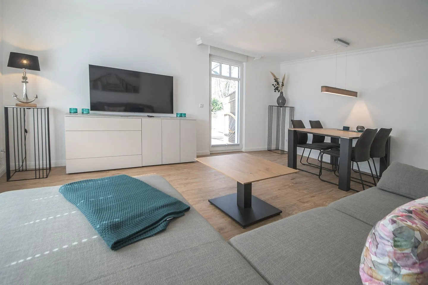 Großer Wohnbereich mit gemütlicher Sofaecke, großem Flachbildfernseher und einem Essbereich für 4 Personen