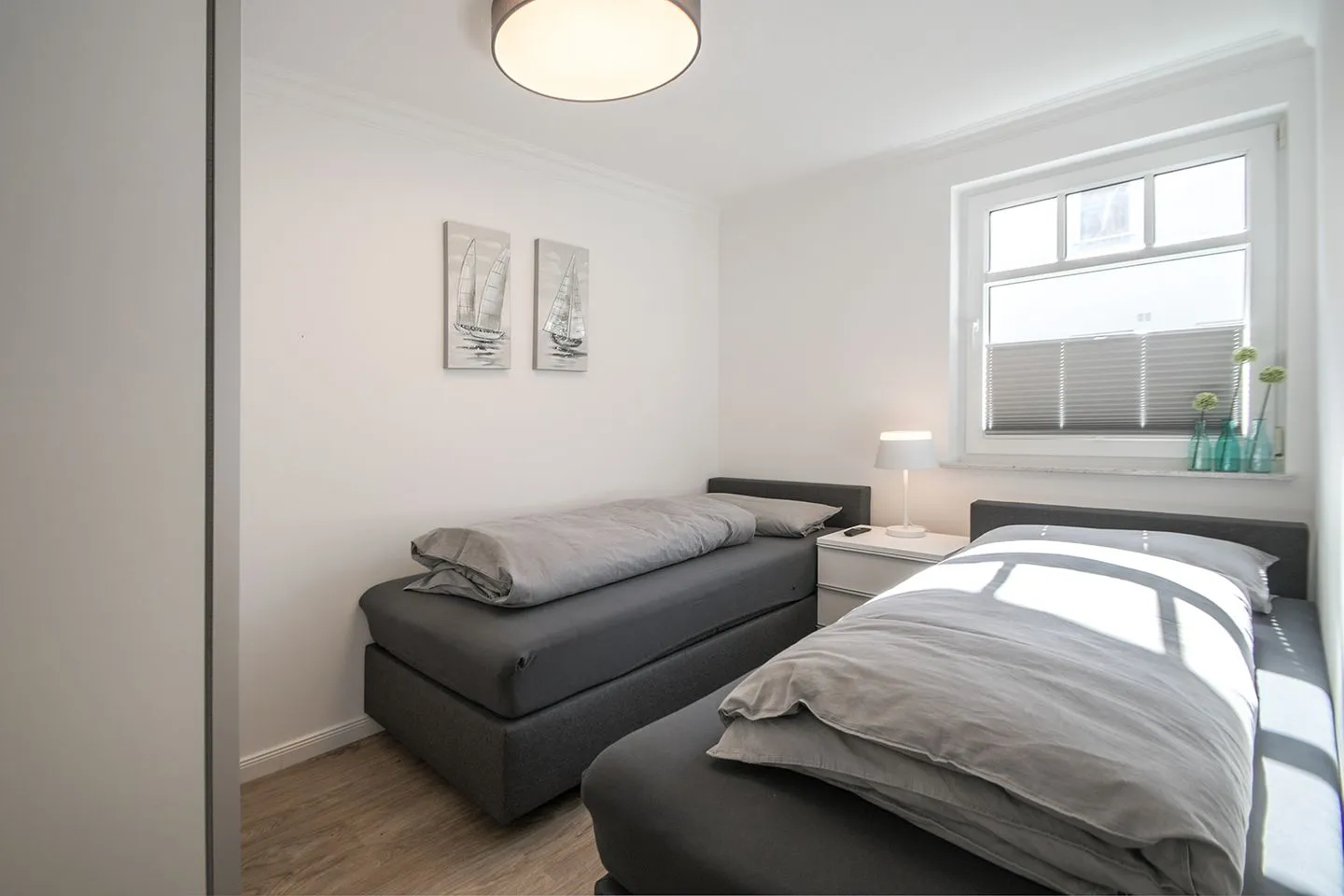 Zwei separate Schlafzimmer mit Boxspringbetten. ein Schlafzimmer bietet ein Doppebett, das zweite Schlafzimmer zwei EInzebetten.