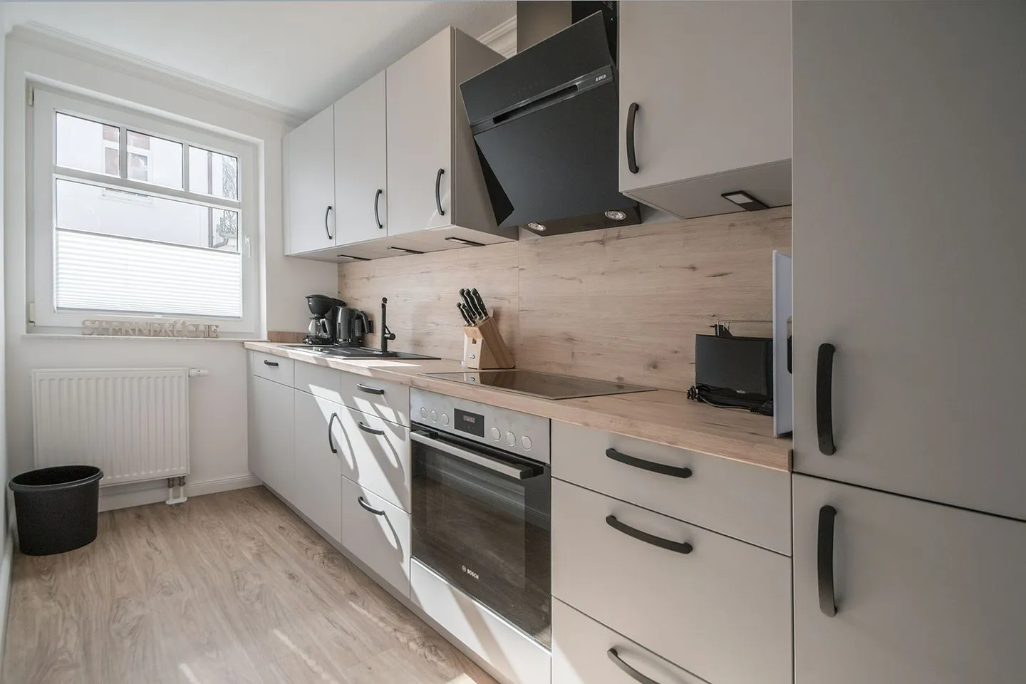 Moderne Küche mit Backofen, Kühlschrank, Cerankochfeld, Toaster, Kaffeemaschine uvm.