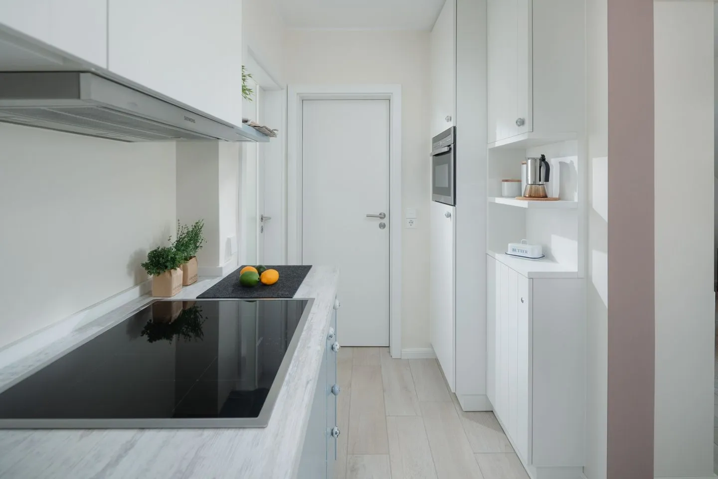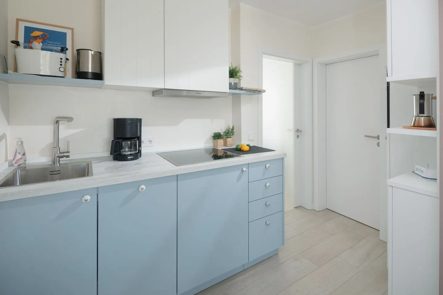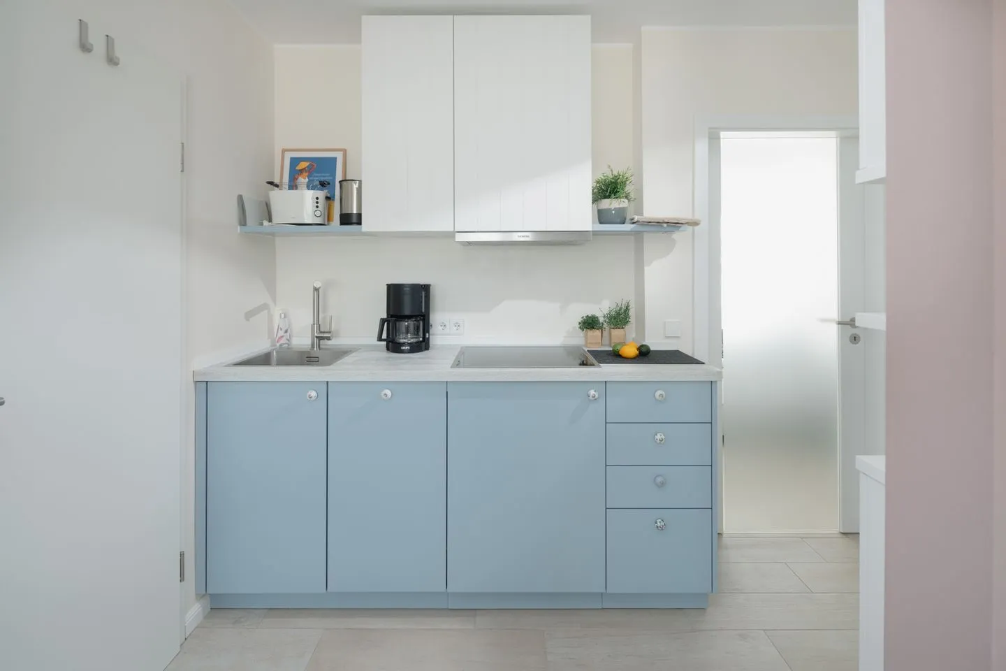 Komplett ausgestattete, moderne Küche mit Backofen, Kühlschrank mit Gefrierfach, Geschirrspüler, Herd, Kaffeemaschine, Mikrowelle uvm.