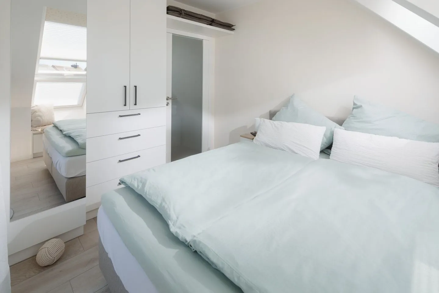 Im Schlafzimmer der Wohnung befindet sich ein 160 x 200 großes Boxspringbett mit hochwertigen Matratzen, ein Flachbildfernseher und ein Kleiderschrank.