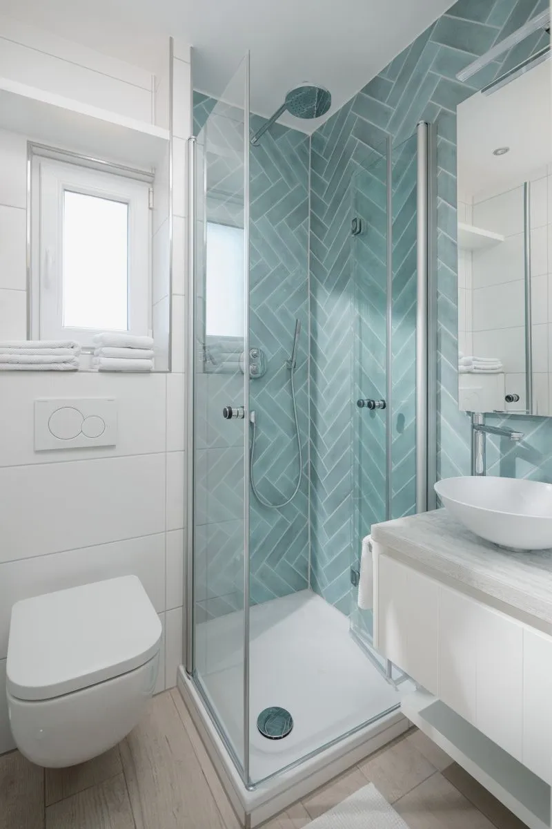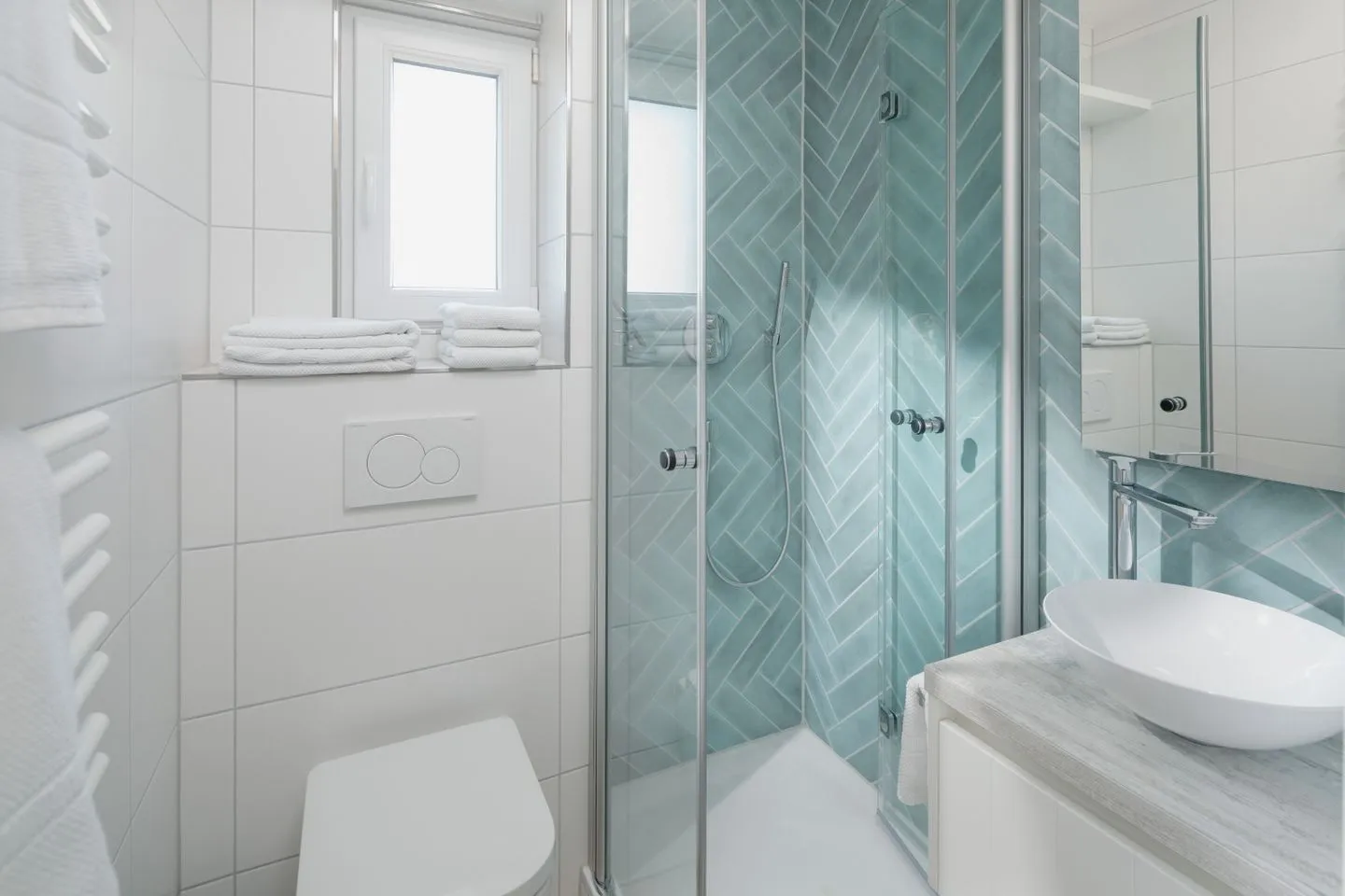 Modernes Tageslicht-Bad mit flacher Dusche, Waschtisch und WC