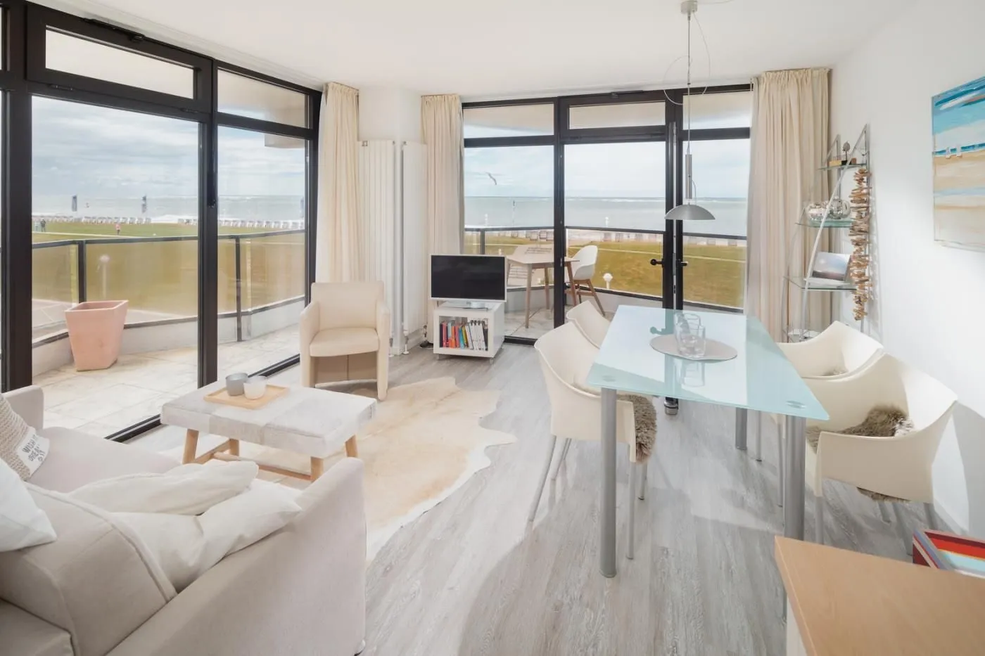 Gemütliches Sofaecke (mit Schlaffunktion), Essbereich für vier Personen, Flachbildfernseher uvm.Vom Wohnbereich aus erreichen Sie den Balkon mit Meerblick.