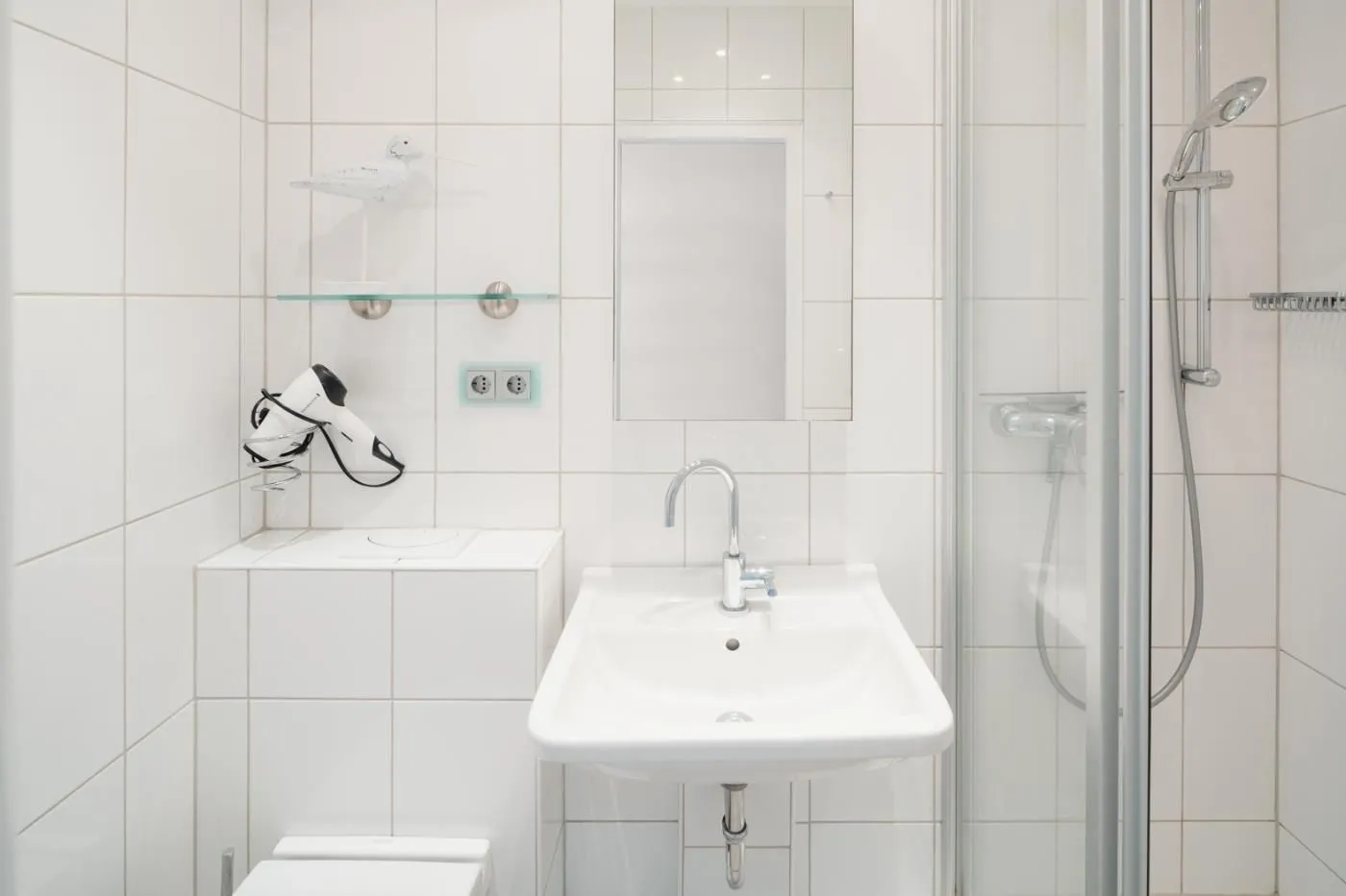 Badezimmer mit Dusche, WC, Waschtisch und Fön