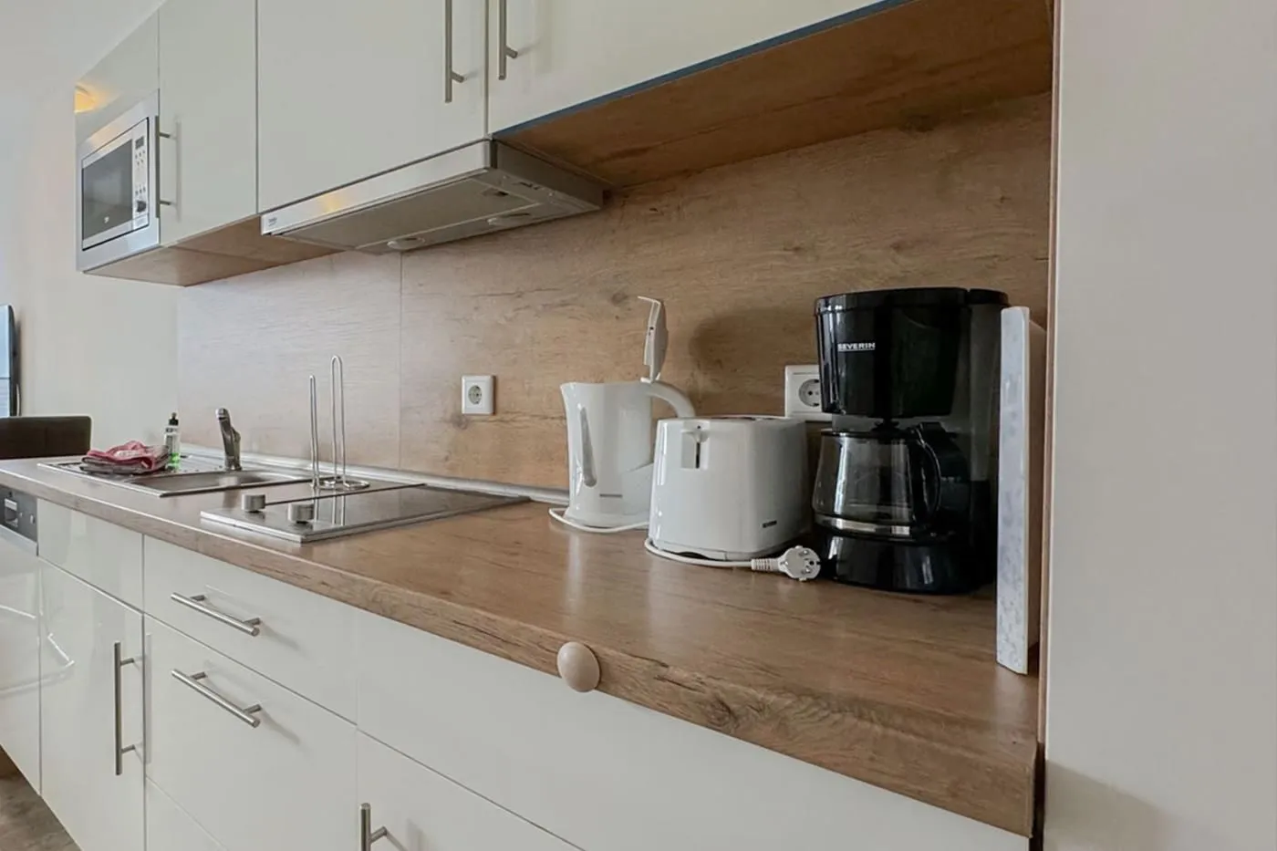 Ihre Ferienwohnung verfügt über eine moderne großzügige Wohnküche mit folgenden hochwertigen Ausstattungsdetails: Ceranfeld, Spülmaschine, Toaster, Kaffeemaschine und ein Kühlschrank.