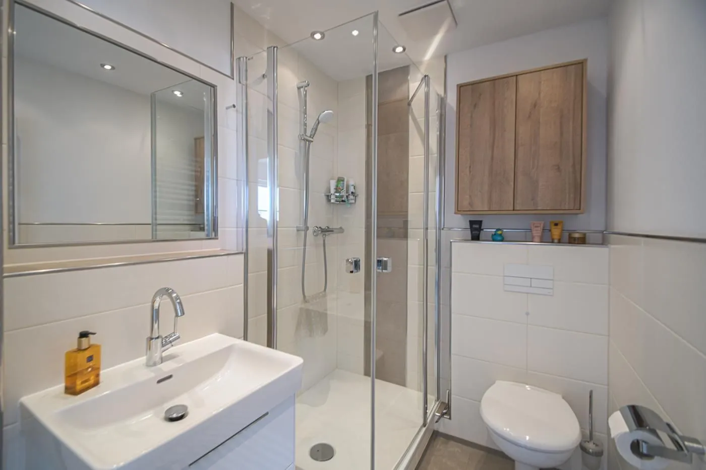 In der Ferienwohnung „Heimathafen“ wartet ein großes lichtdurchflutetes Schlafzimmer mit einem 180cm x 200cm großen Boxspringbett auf Sie. Von hier aus genießen Sie seitlichen Meerblick. Bei geöffnetem Fenster können Sie hier dem Meeresrauschen lauschen. Ein Reisebettchen & ein Hochstuhl sind vorhanden. Ein großer Kleiderschrank und eine Kommode sind weitere Ausstattungsmerkmale des Schlafzimmers. Von diesem Raum aus erreichen Sie das moderne Bad.