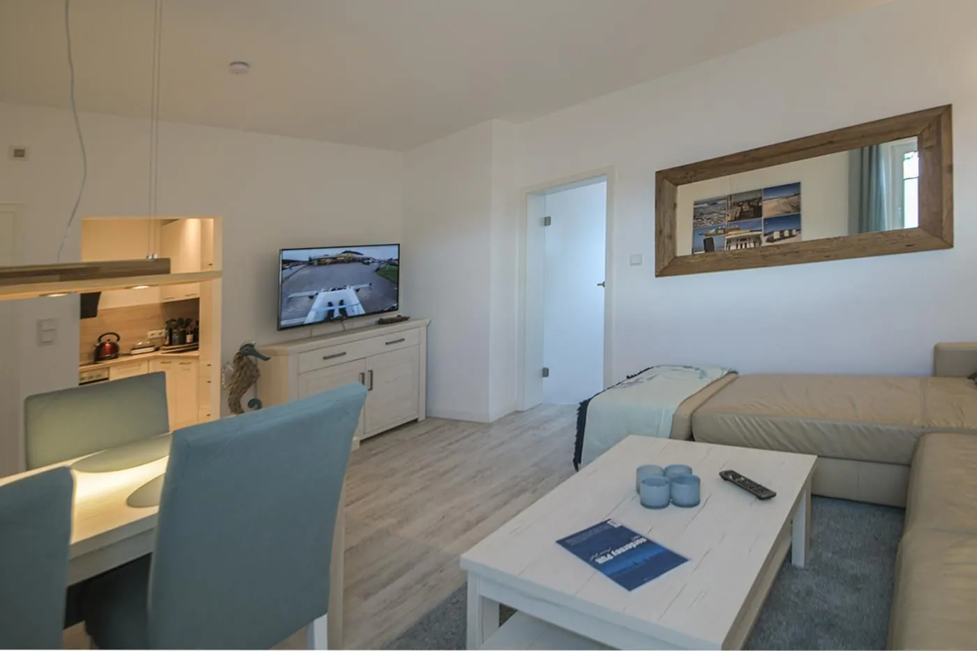 Heller Wohnbereich mit Esstisch, Flachbildfernseher und gemütlichem Ledersofa, welches mit hochwertigem Lattenrost und Matratze ausgestattet auch als Schlafsofa genutzt werden kann.